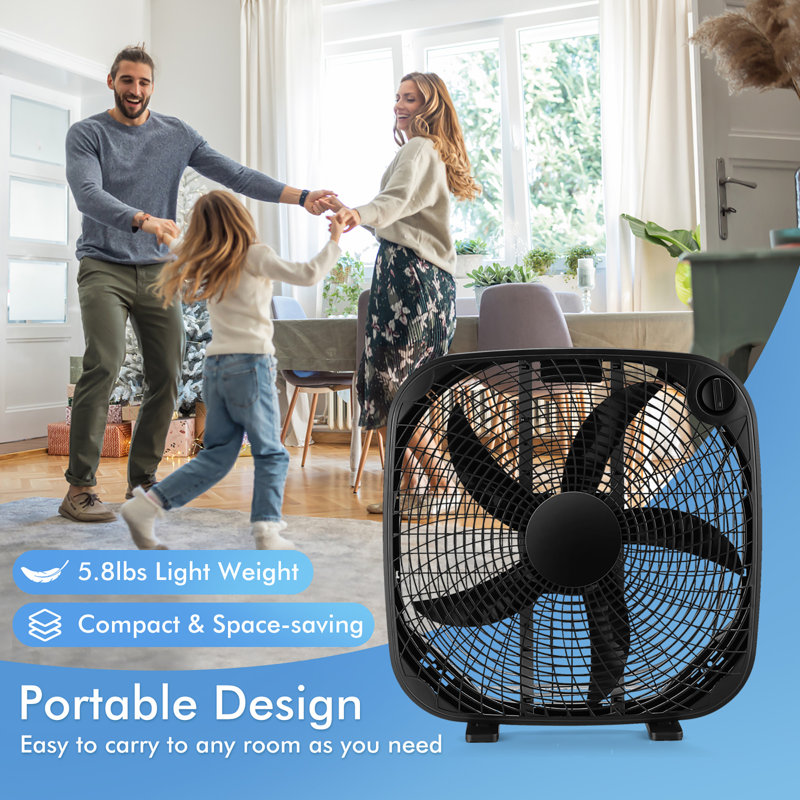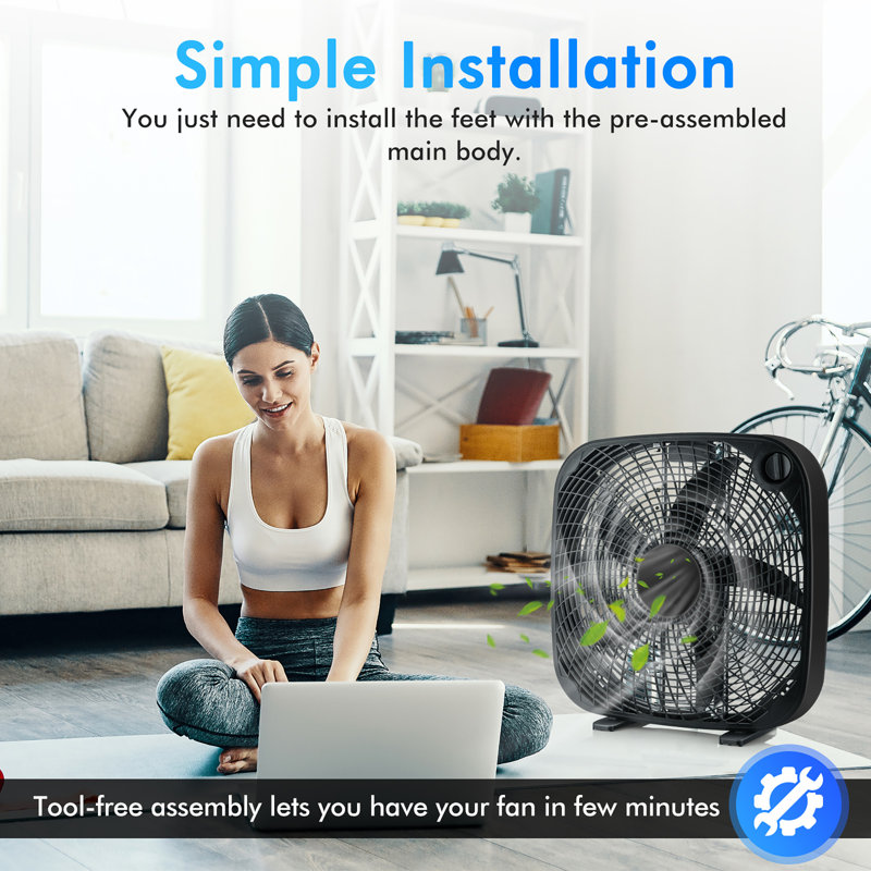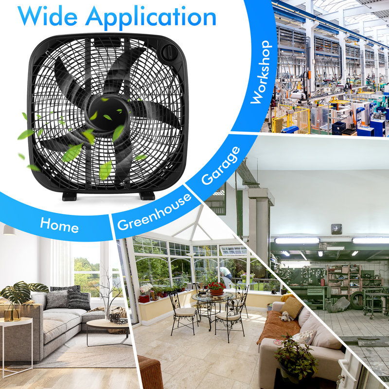 Equipped with a high efficiency motor and 5-blade air supply, this 20-inch box fan can deliver strong airflow while costs very little to run all day. 3 speed settings allow you to select your fan speed easily by rotating the knob for optimal comfort and airflow. The built-in carry handle and back recess for power cord storage are designed for added convenience. The high quality pp cover is durable and not easy to deform. Besides, the box fan comes with attachable supporting feet for added stability. The compact and lightweight design allows you to easily place the fan anywhere you need cooling. With a sleek appearance, quiet operation, easy maintenance and energy-saving design, this box fan is suitable for various occasions, such as the home, office, dormitory, garage, workshop, etc.