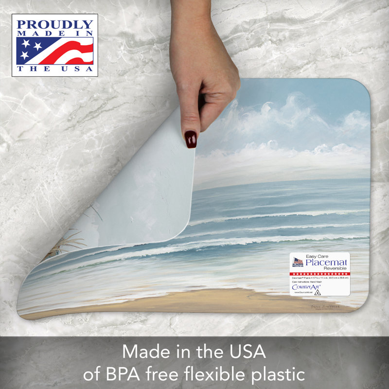 Made in the USA of BPA and PVC Free flexible plastic. Placemat measures 17.13†x 11.25†x .15â€. Placemats fit perfectly on any table. Reversible with coordinating image on each side. Easy Care Placemats protect your table or countertop from spilled food, scratches, or stains. Flexibility of the Placemat allows for easy transfer of crumbs and waste to the trash receptacle. Beautiful Designs allow the Placemat to remain displayed even when not in use.