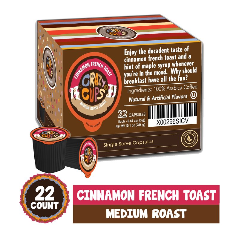 ECO-FRIENDLY: Crazy Cups maple french toast coffee single serve pods for Keurig Machines are packaged in recyclable capsules. Enjoy your perfect cinnamon flavored coffee with notes of maple syrup french toast while doing right by mother nature.