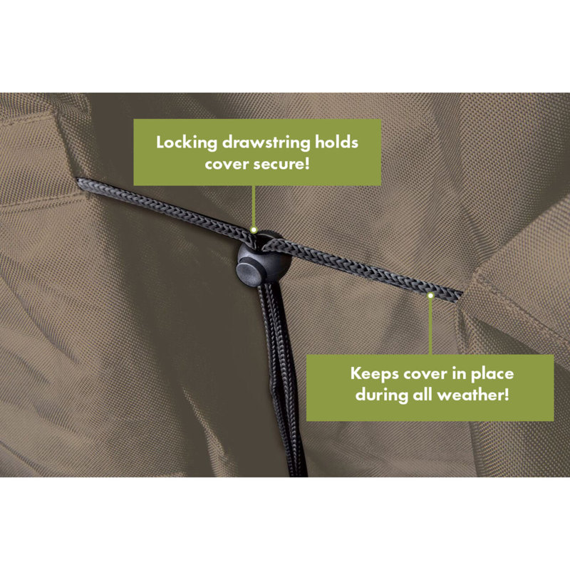 Great cover, not as thick as I thought it was going to be, however, it has great latches and drawstring. Feel very confident that it won’t blow off. Would recommend!