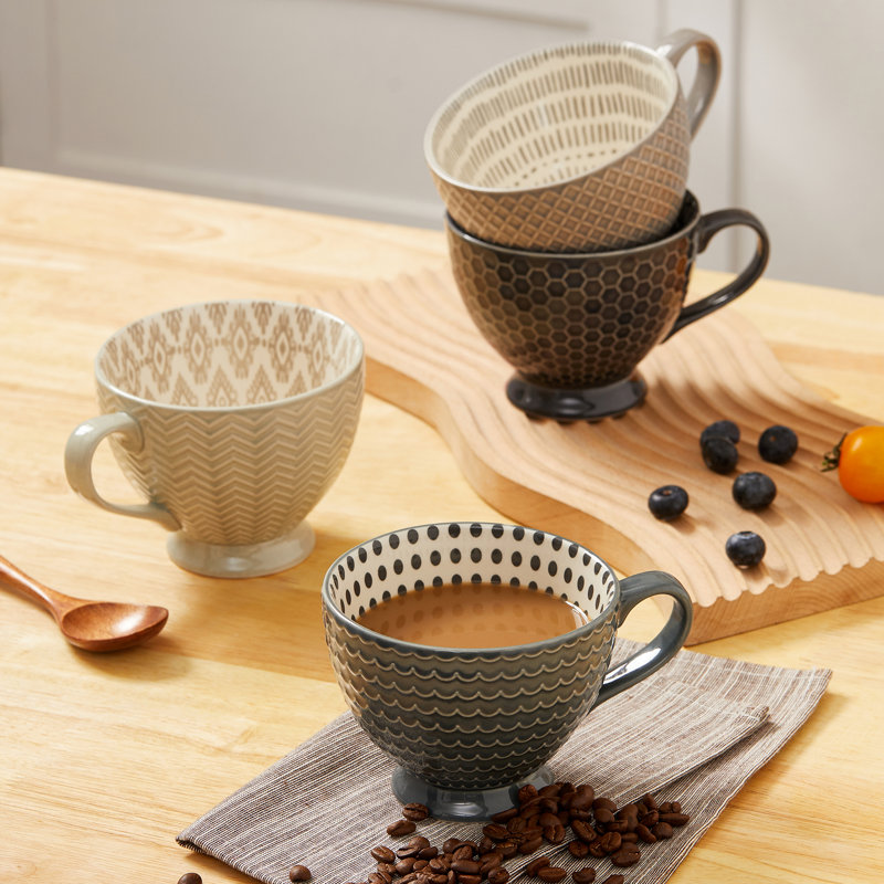Start off your morning right with a steaming mug of hot coffee, tea, or cocoa. This set of four, footed mugs makes the perfect vessel for your favorite hot drink. Each one holds 14 oz. and is crafted from stoneware. Each one showcases an embellished outside and patterned inside, perfect for modern or boho kitchens. This batch is easy to use. All you have to do is place it in the dishwasher. And if you need to warm up quickly, they are also safe for the microwave.