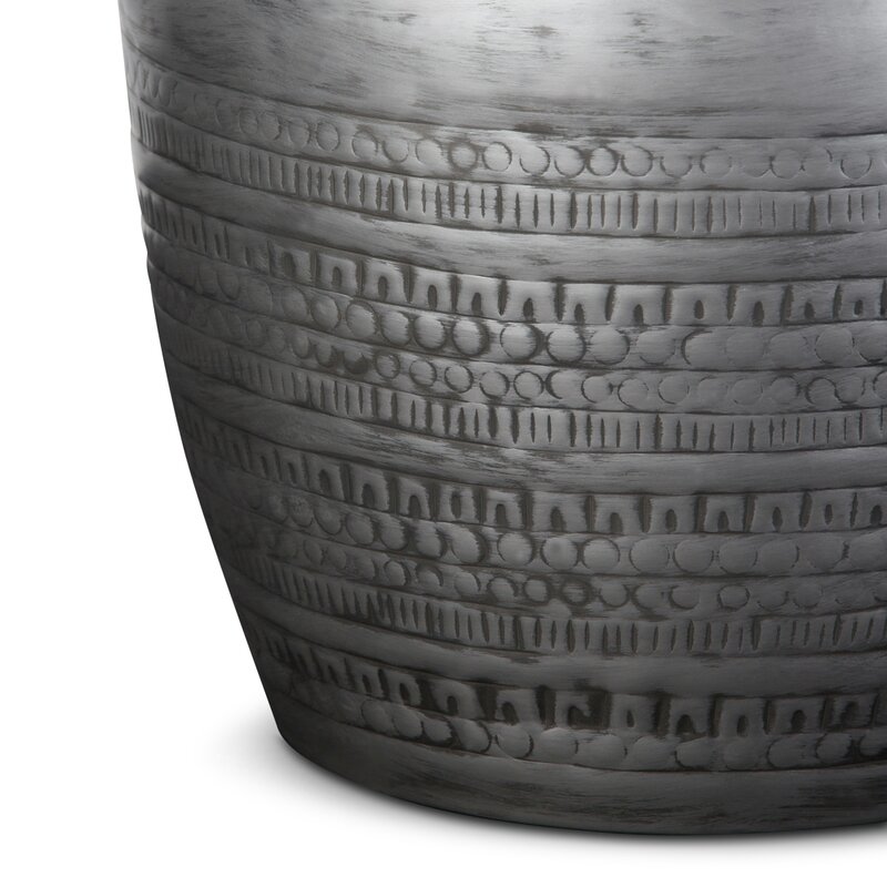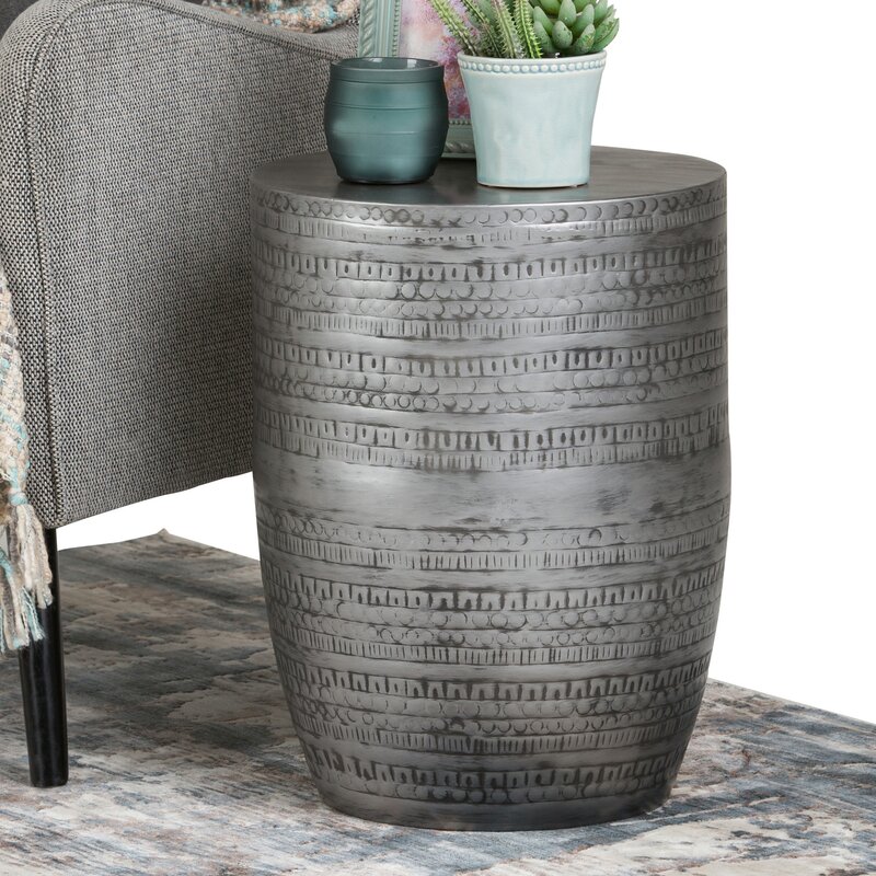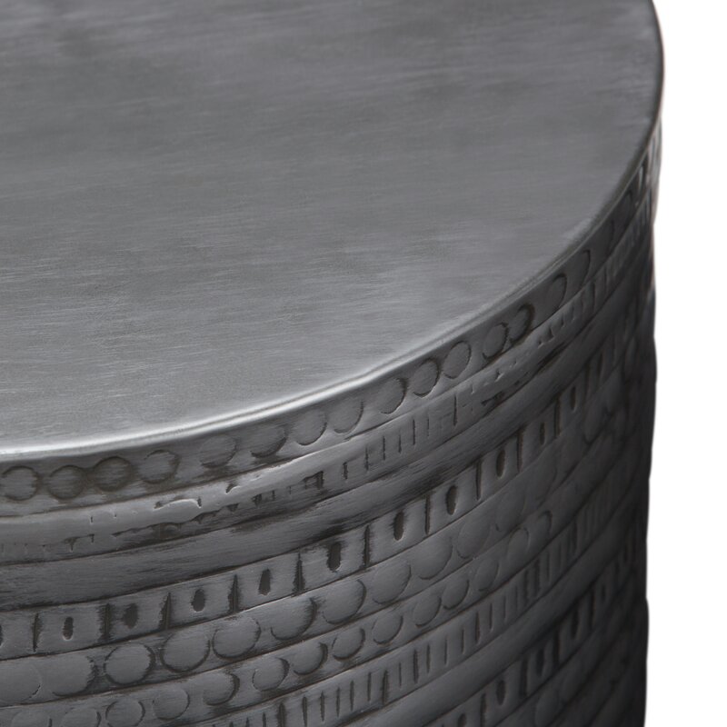This end table provides a great finishing touch to virtually any space. Crafted from iron, the table features a distinctive antique silver textured finish. The table has a unique look and can be used as an accent piece in any room. Use it as an end table by a couch or chair or in the bedroom as a side table.