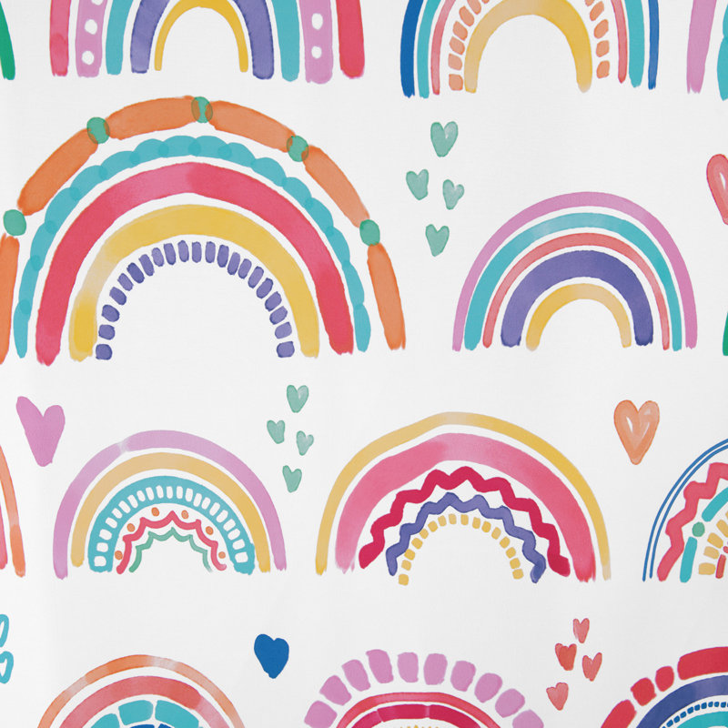Enchanting rainbows and hearts themed design in refreshing multi-colored brights on a white ground