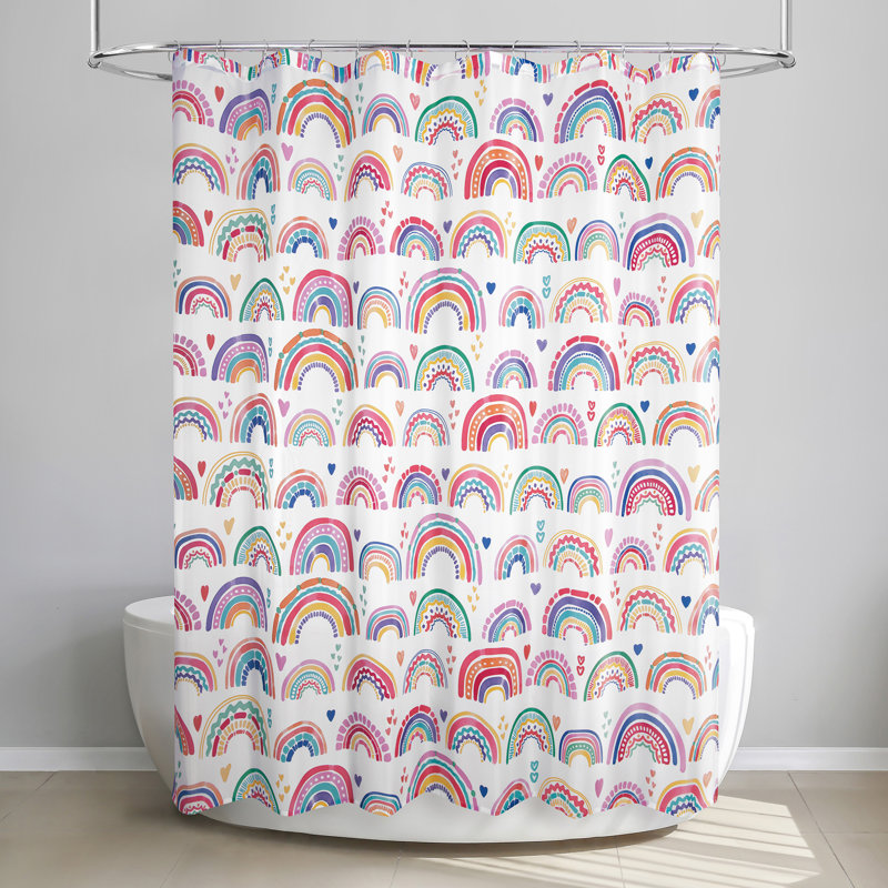 Create an enchanting atmosphere in your bathroom. This cheerful full coverage print, in refreshing multi-colored brights on a white background, features artsy rainbows mixed with romantic hearts. This eye-catching design is perfect for kids and tweens and will surely dress up and enliven their bath space. This shower curtain measures 70″ x 72″ and fits most standard sized tubs and shower areas providing privacy and protection from water splashing onto the floor. Crafted from 100% easy care polyester taffeta fabric with a reinforced buttonhole top that works well with standard shower hooks and curtain rods. Use of a liner is recommended. Machine wash and tumble dry on low heat. Complete the look by coordinating with other pieces in the Collection or use alone.