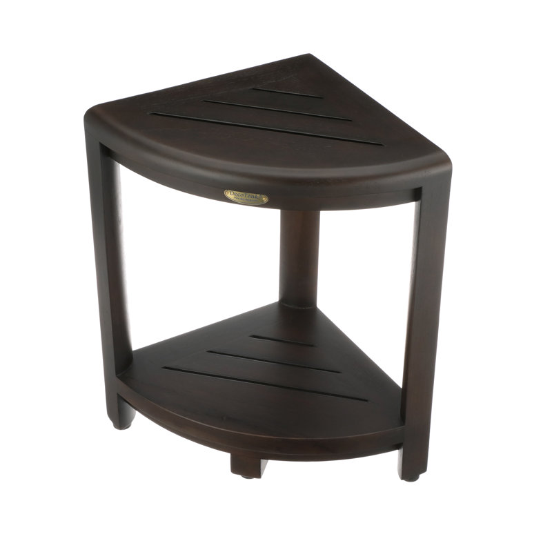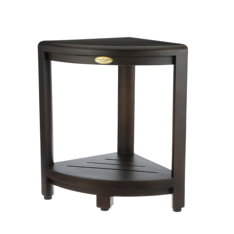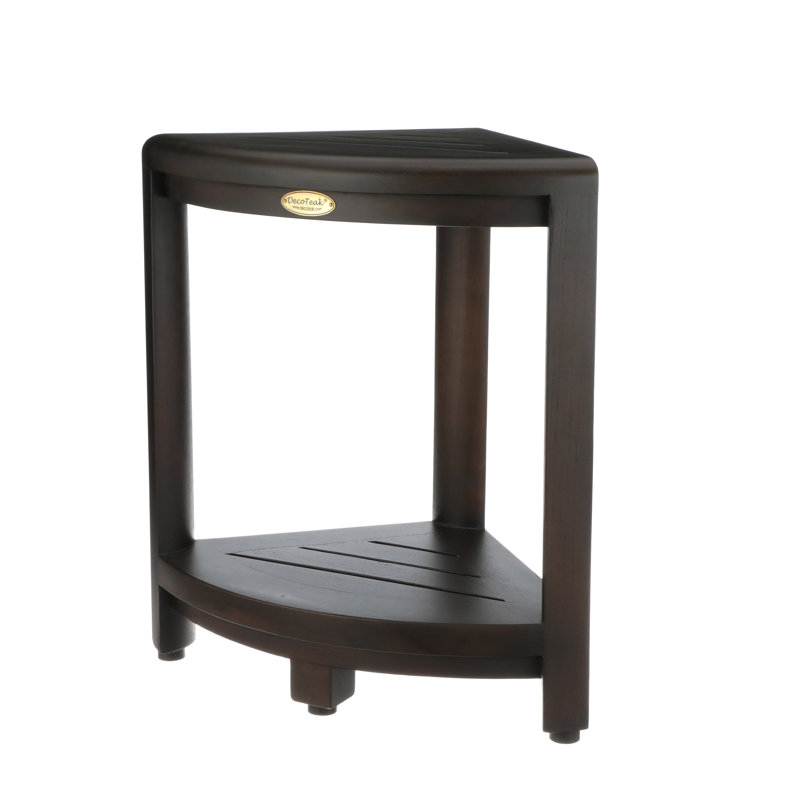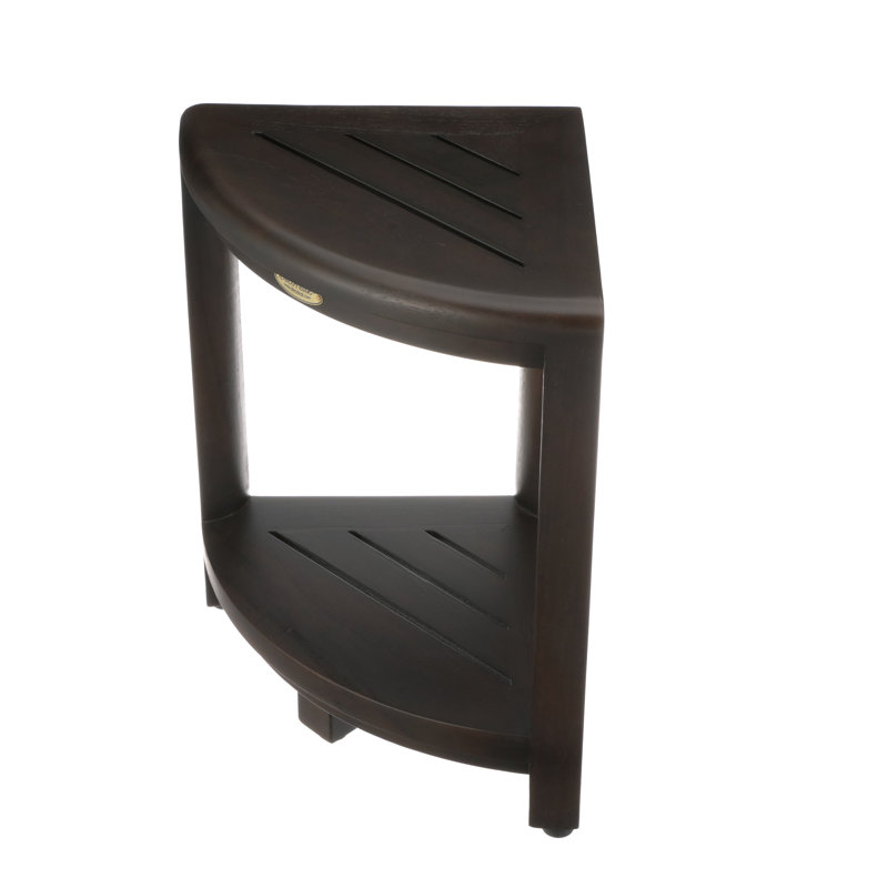 This Decoteak high teak 2 tier corner Bathroom Shelf is compact enough that it can actually be placed in a corner of your shower. The included foot leveling pads allow you to assure level surface for a sloped shower floor. There height also provides convenient surface to rest your leg on while shaving. No more clutter of shampoo bottles, soaps, and other shower accessories jumbled on small shower shelf. This provides added storage and organization space for your shower. The height is ideal to rest your foot on while you shave. It also fits great in a corner of your bathroom for those extra toilet paper rolls, towels, magazines, and even your favorite reading book. The corner design has a most effective use of space in limited space areas, as most people have one underutilized corner. It has been the wood of choice for hundreds of years of luxury boat builders. This natural resistance has been supplemented by using the proprietary Decoteak stain which is a deep penetrating stain with added mold, mildew, and fungus inhibitors. It provides ability for this teak furniture to be used outdoors as well as indoors.