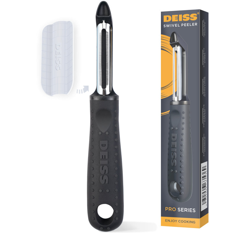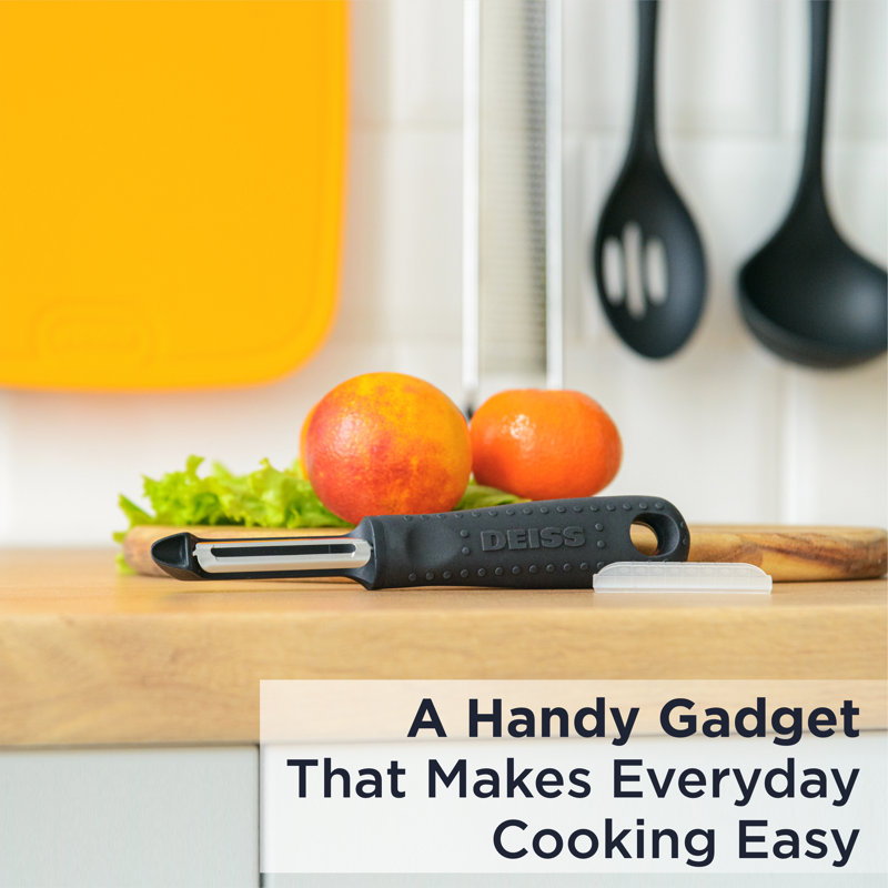 Forget the risk and enjoy fast, efficient, and smooth meal prep with an original premium Vegetable Peeler from Deiss. It is made of a professional-grade design versatile and great for both fruits and vegetables. The stainless steel peeler contains sharp dual blades that effortlessly cut through produce peels and skins.