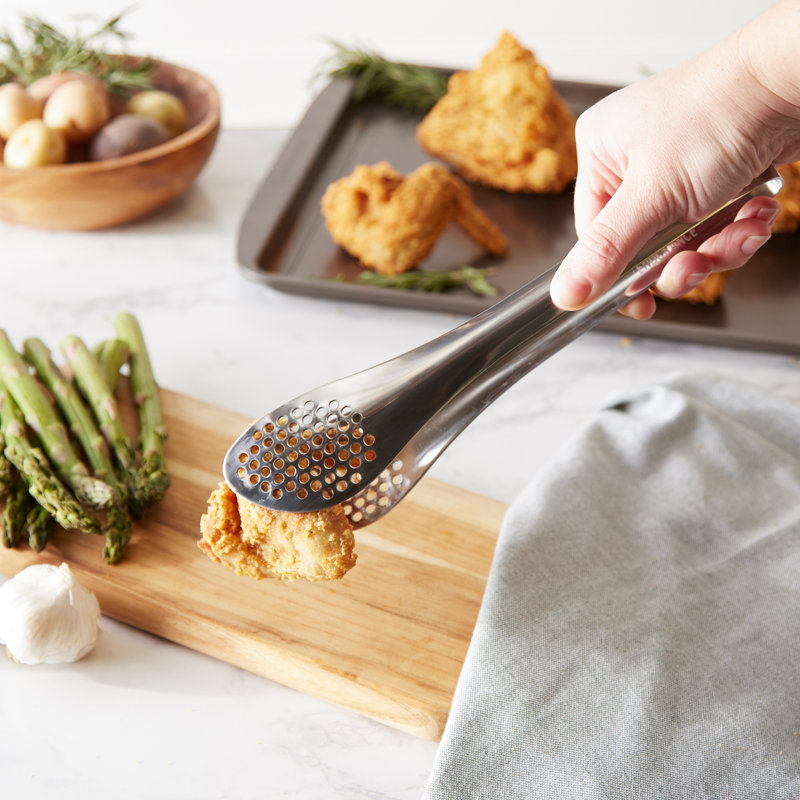 Use to strain vegetables, toss salads, or pick up hot foods with just one hand.