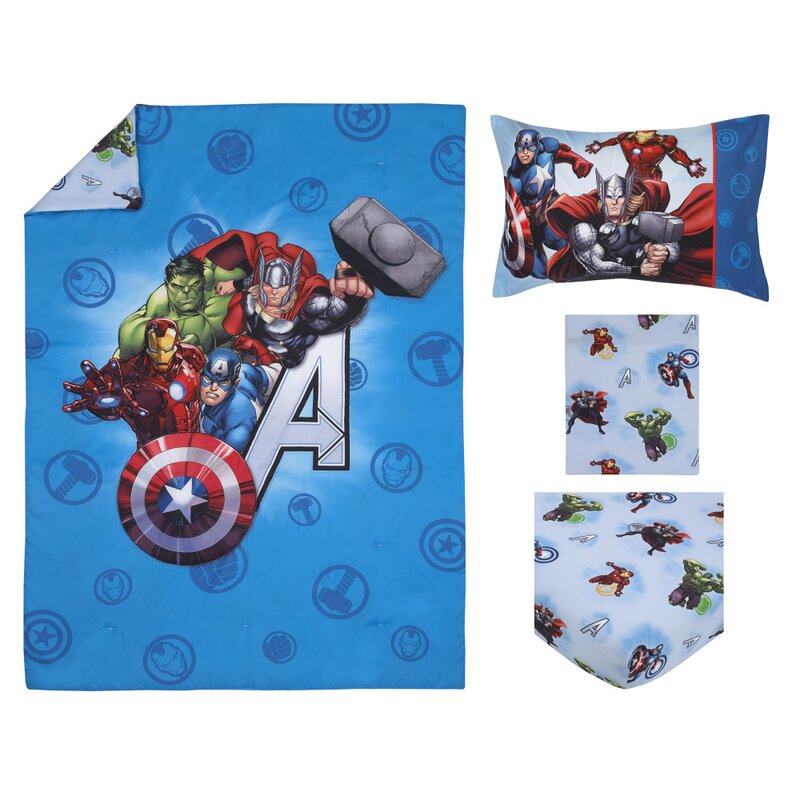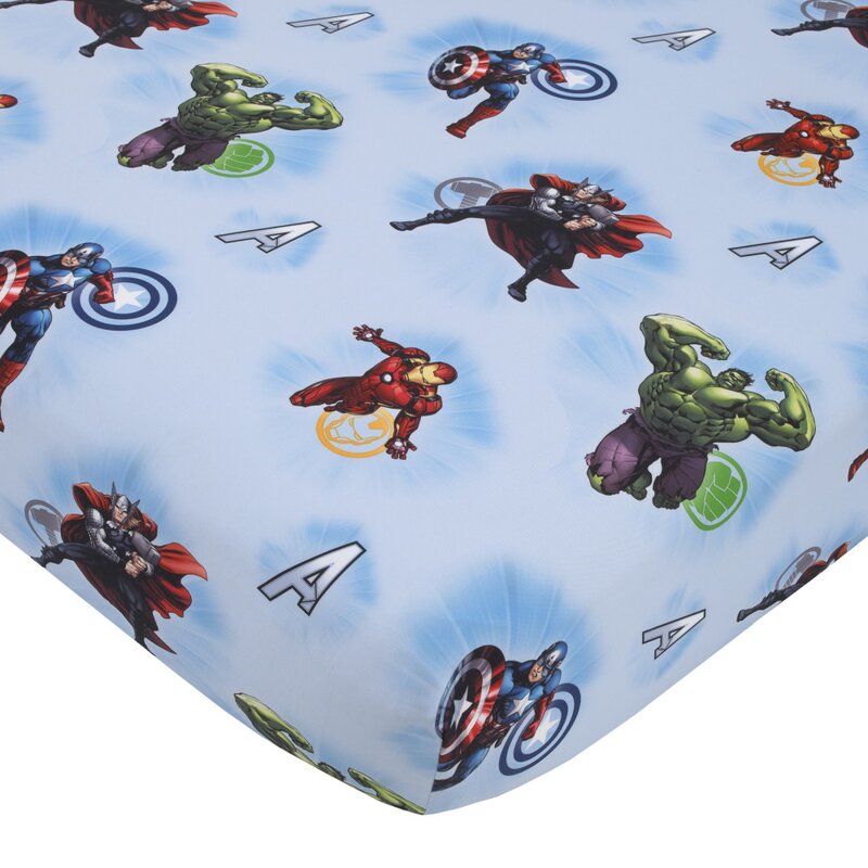 Your favorite superheroes are the stars of the Avengers Fight the Foes 4 Piece Toddler Bed Set. The 4 Piece Toddler Bed Set includes a comforter, fitted sheet, flat sheet, and reversible pillowcase. The 57″ x 42″ printed comforter features Iron Man, Hulk, Thor, and Captain America on a blue background. The character print sheets have a light blue ground, with the iconic Avenger letter A and a tossed print of Iron Man, Hulk, Captain America, and Thor all in action poses. 28″ x 52″ fitted sheet has fully encased elastic sides for a snug fit on a standard size 28″ x 52″ crib/toddler mattress; the flat sheet measures 60″ x 45″. The reversible 20″ x 30″ pillowcase has Thor, Iron Man, and Captain America on one side, and reverses to Hulk and Iron Man on the back – both sides have a printed blue cuff trim. Machine washable, easy to care for soft fabrics for a comfortable night’s sleep.