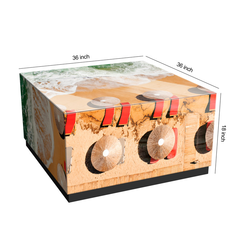 Set Table -Paradise is at the tips of your fingers when you see this amazing sandy and wavery beach and water combination; the thoughts this evokes are of warmth, happiness, freedom, family & friends, on an endless Saturday afternoon. This vacation on a tropical island is only starting, and there is not a better moment in time to close your eyes and feel the sun on your face and the water on your skin. Add an artistic flair to any room with this beautiful and functional 36″ x 18″ x 36″ & 22″ x 22″ x 22″ cocktail table of reverse printed beveled edge art glass on a black plinth base that enhances its vibrant colors and textures. Create a cohesive designer look by purchasing two or more coordinating lamp tables.