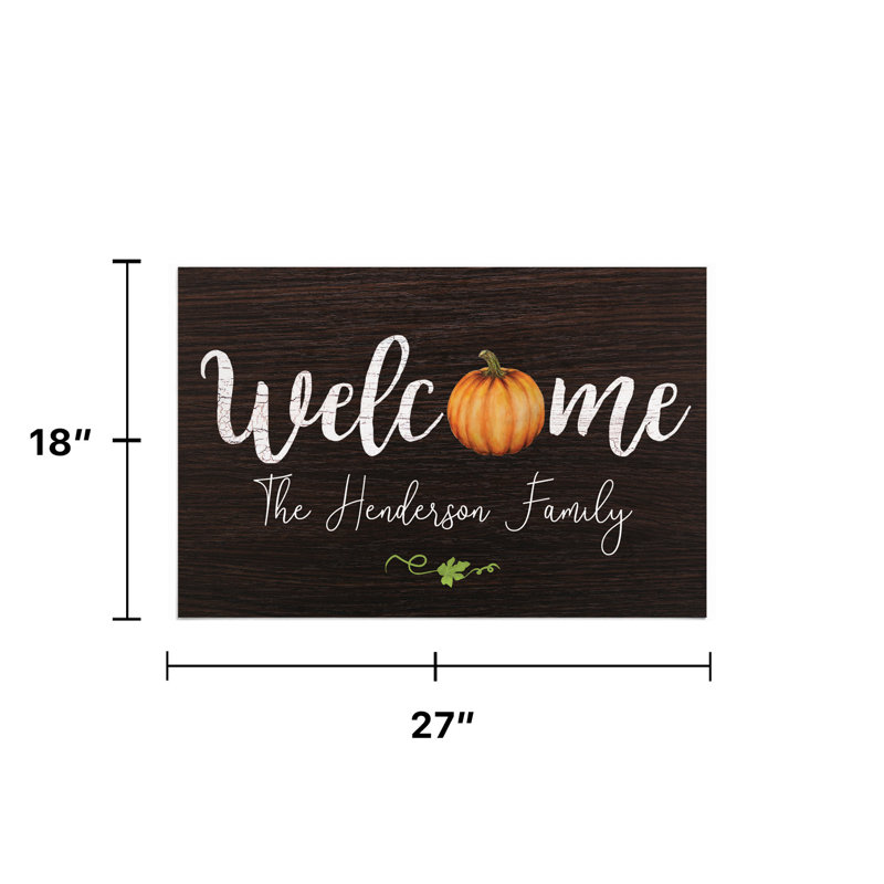 Pump up your Autumnal decor with this pumpkin doormat design you can customize! Perfect for adding seasonal flair to your entryway, this beautifully Autumnal design features “welcome” with a vibrantly-orange pumpkin in place of the “o” and a line of text below. Add a family name, special message, or any desired personalization to make this delightful design one-of-a-kind! “The” and “family” are NOT automatically included. This design does not support ALL CAPS. Please do not use all uppercase letters when personalizing. Constructed with a polyester non-woven durable fabric surface and a non-slip rubber backing, this 18-inch by 27-inch rectangular mat is ideal for indoor and outdoor use. Any woven or textured look to the mat is part of the image design and not part of the floor mat construction. A quick garden hose rinse provides easy cleaning for this mat. Doormat frame not included. Personalized Planet is a leading online retailer specializing in personalized gifts for special occasions, holidays, and celebrations. Our wide selection of customized productions makes excellent gift ideas for birthdays, Christmas, Mother’s Day, Father’s Day, Grandparent gifts, and more. We also carry a large selection of licensed children’s products for popular brands such as Paw Patrol, Peppa Pig, Wild Kratts, JoJo Siwa, Monster Jam, and others. Our officially licensed products are available in products such as kids’ beach towels, pillowcases, apparel, backpacks, room decor, and more. Personalized Planet provides the opportunity to give a truly unique and memorable gift!