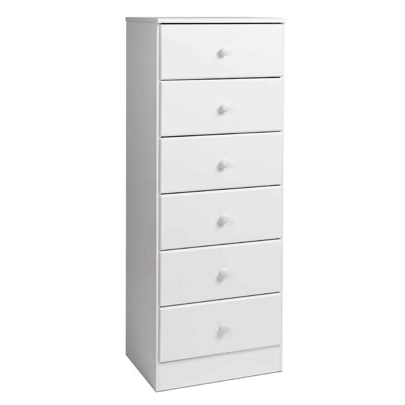 A slender profile, sturdy flat top, clean lines, profiled drawer fronts, and solid wood knobs amplify a contemporary design with a sleek laminate finish to make this the ideal timeless dresser for the bedroom, complementing any decor style. It houses six sizable storage drawers for clothes and other belongings, running on smooth roller glides with built-in safety stops to keep each drawer in place. This compact dresser is a space-saving organizer for bedrooms, walk-in closets, nurseries, living rooms, or entryways, and it can also provide a display area for small lamps, electronics, picture frames, and more. Made from non-toxic, CARB-2-compliant laminated composite wood with a sturdy back panel, this chest of drawers will reliably protect your clothing.