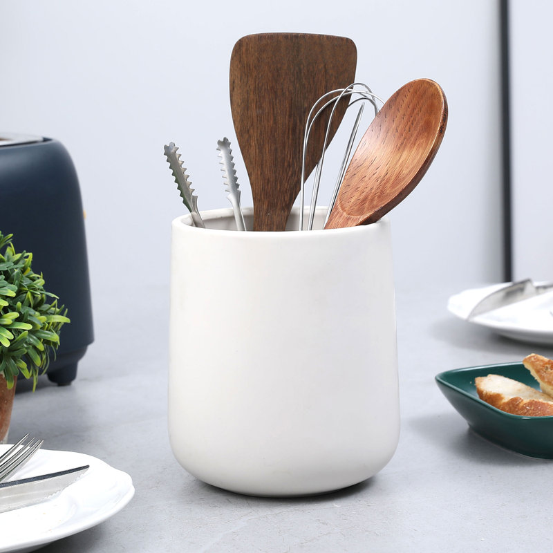 6-inch ceramic kitchen crock cookware utensil holder with a matte white finish for keeping a tidy and organized kitchen.