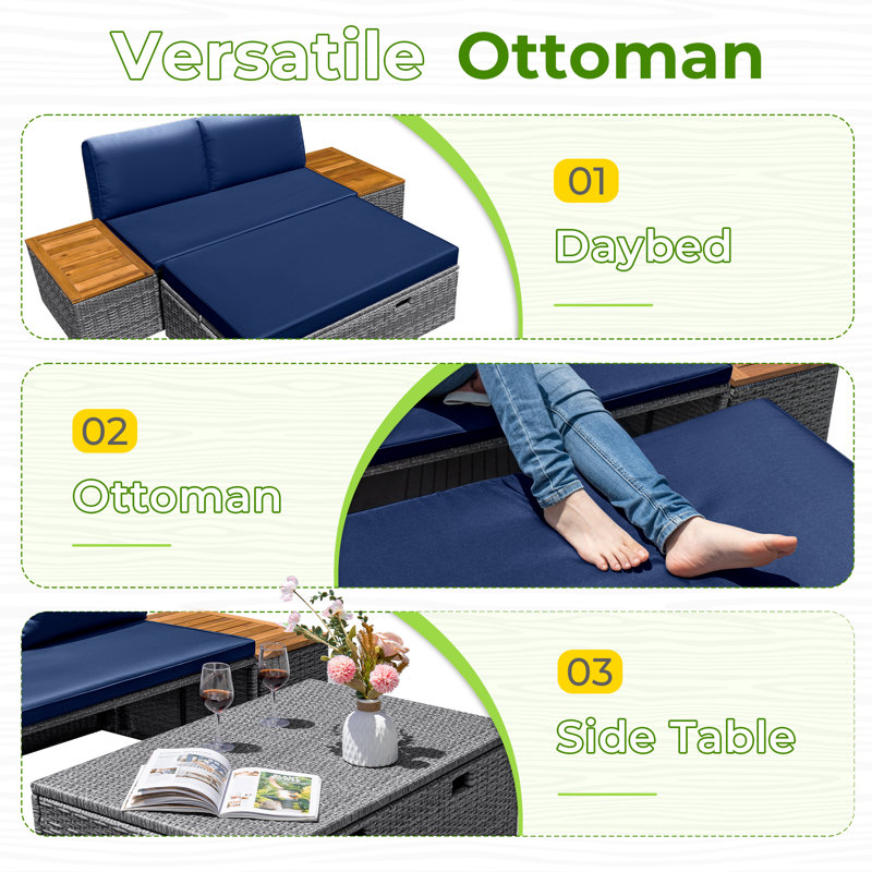 This modern and simple Outdoor Patio Daybed has simple lines, beautiful and practical. This rattan sofa bed has a sofa, a footstool and two side tables. You can combine a sofa and footstool into a sofa bed to provide a spacious space for you and your friends and family to lie on and enjoy a relaxing time.Outdoor recreational beds have powder-coated alloy steel frame covered with PE wicker, UV resistant, weather resistant, low maintenance. Delicately woven and strongly crossed structural steel frames provide more stability that you can use for a long time. This patio furniture is the perfect addition to any outdoor space. At the same time, the rattan system can add a sense of luxury to the garden, roof, backyard and make your home more attractive.