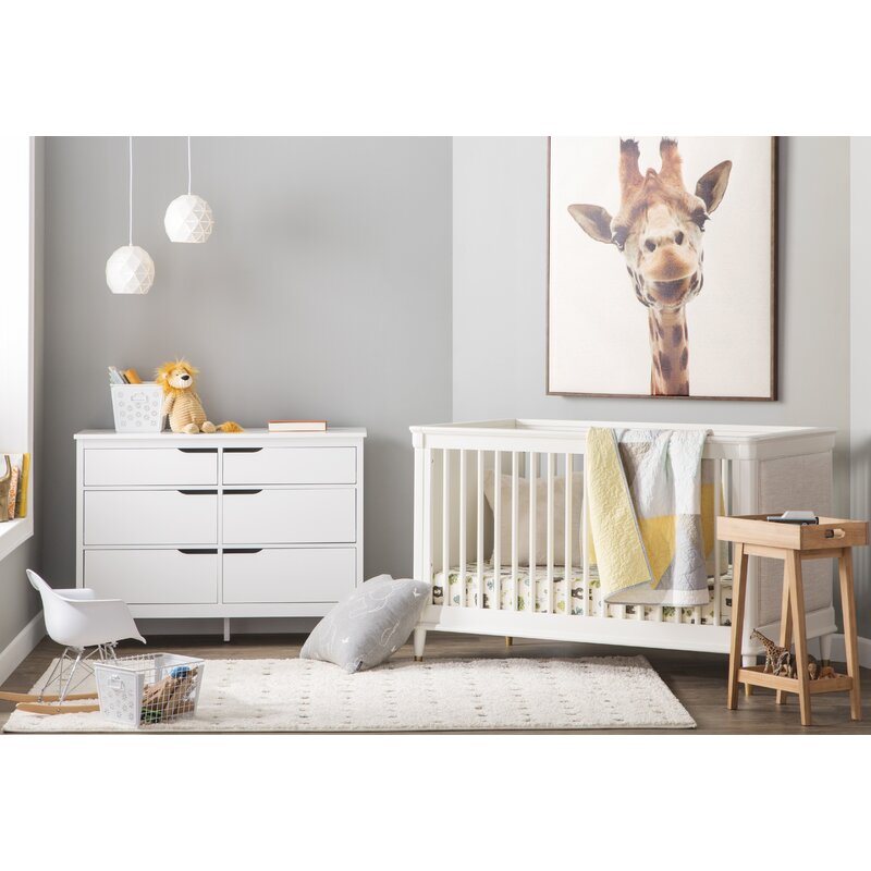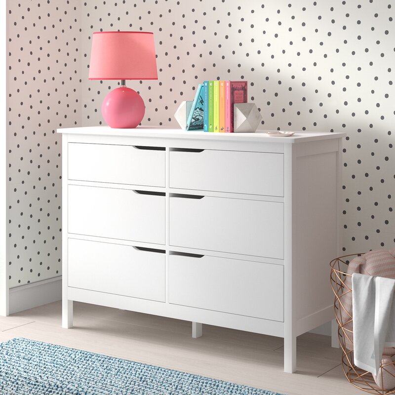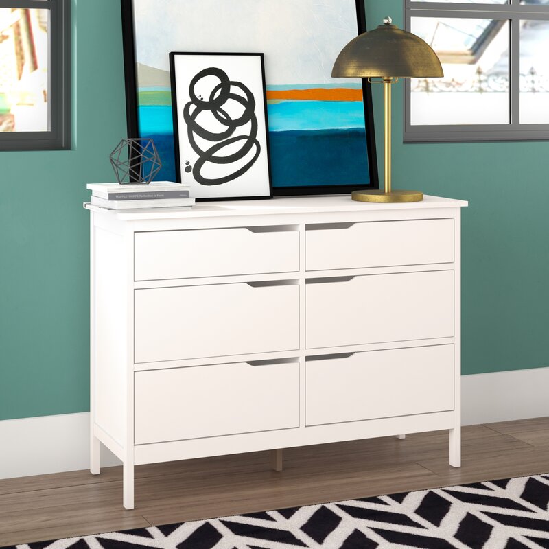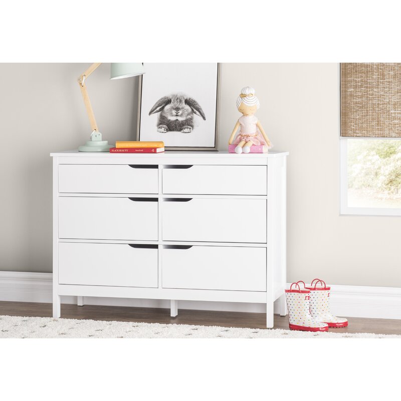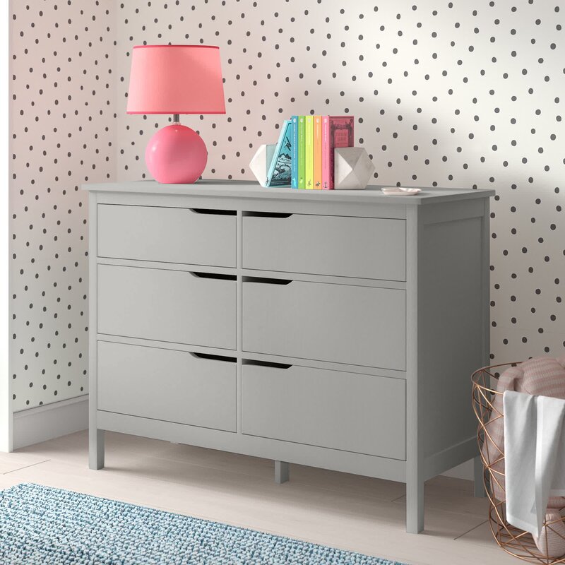 Tuck away tanks, tees, and trousers in this clean-lined again 6-drawer double dresser. Crafted from manufactured wood with pine veneers, the bas double dresser features six drawers on metal glides with cutout handles and safety stops that provide a place for your wardrobe. A neutral finish gives this design the versatility to blend with any color palette you pick. Spanning 46.5″ wide, its top offers a spot to show off framed family photos, artful accents, and potted plants for a personal touch. Assembly is required.