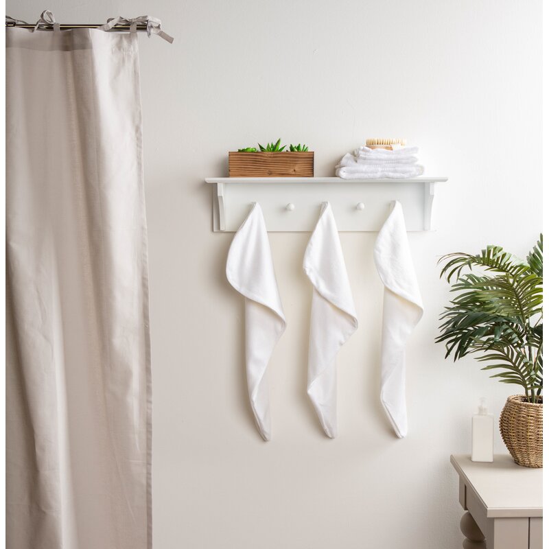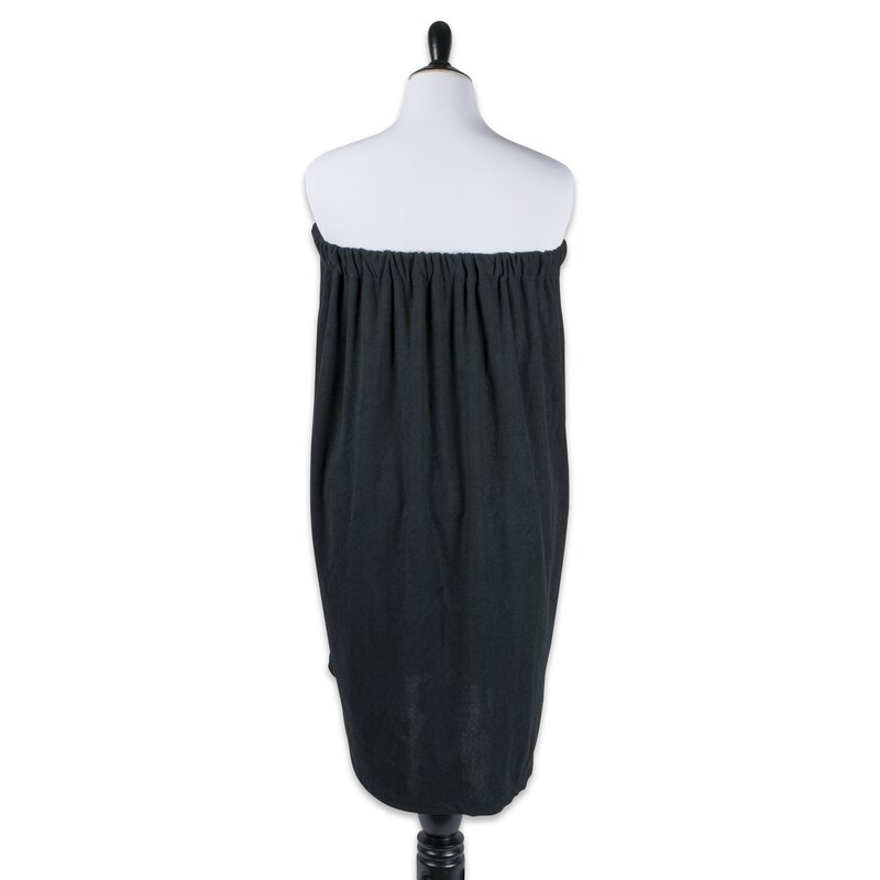 Adjustable hook and loop fastener closure and elastic top make the shower wrap easy to wear.