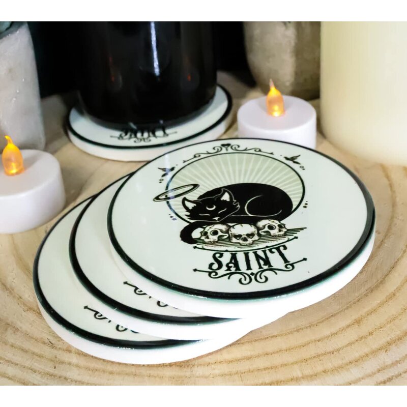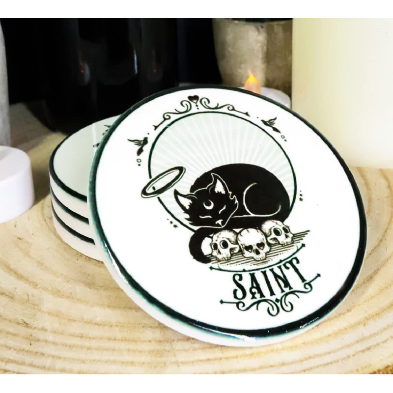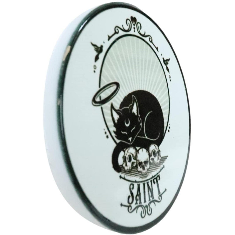 This mystical black cat has a halo over its head and a horizontal crescent moon on its forehead. It sleeps on a pile of skulls and the word SAINT beneath them. Angel or devil? You decide!