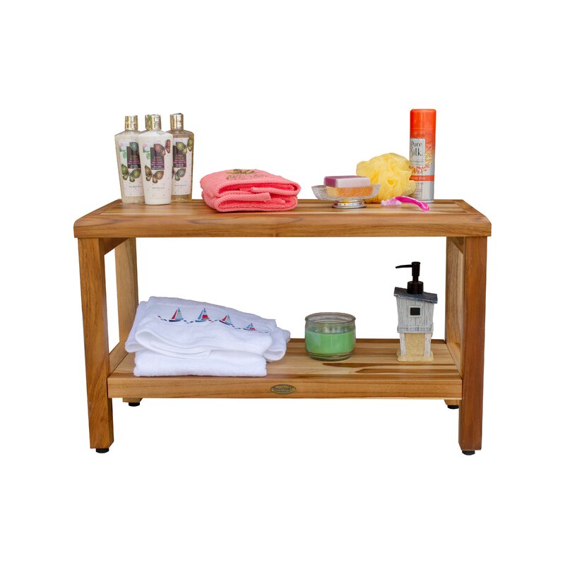 Let the natural beauty of wood be highlighted in your home with this shower bench. Well coated to protect the wood, bring out the natural grains and colors of the teak wood. The included standard utility shelf provides extra storage for toiletries or towels. This compact provides a compact footprint that will fit in most tight areas. These stools include foot leveling pads to provide extra flexibility and stability to allow stabilization due to any minor slope and uneven surfaces, like shower floors. Teak is naturally water, mold, and mildew resistant due to its natural density and high oil content. It has been the wood of choice for hundreds of years of luxury boat builders. This natural resistance has been supplemented by using their proprietary EcoDecors sealer which is a deep penetrating stain with added mold, mildew and fungus inhibitors. It provides the ability for this teak furniture to be used outdoors as well as indoors.