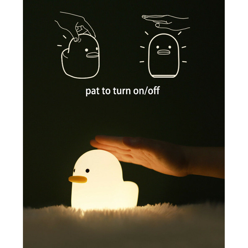 First press the bottom power button to turn it on/off. Then gently squeeze the silicone lampshade or tap the duckling body to turn on/off the night light.