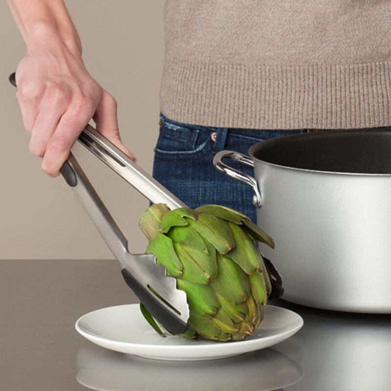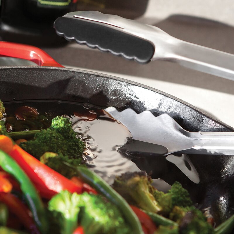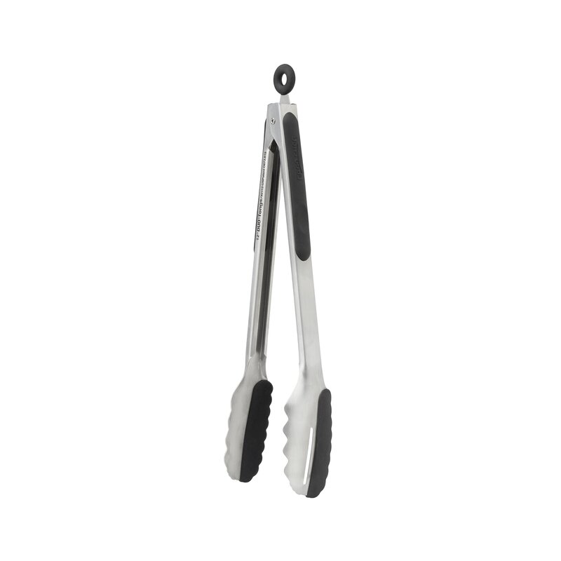 The 12″ Pro-Series locking DUO Kitchen Tongs feature our patented half 500-degree silicone (BPA Free) and half stainless steel heads, which make them safe for all types of cooking surfaces and picking up just about anything. They have a single drain slot on one side and a solid head on the other for scooping sauce. The tong heads are slightly angled for picking up delicate foods easier on the silicone side. The TPR non-slip grip with the spring tension gives you full control. They also feature a round loop locking ring that slides out to lock the tong shut or slide in and stays put so your kitchen tongs stay open during use. These are “The Only Tongs You’ll Ever Needâ€(R).