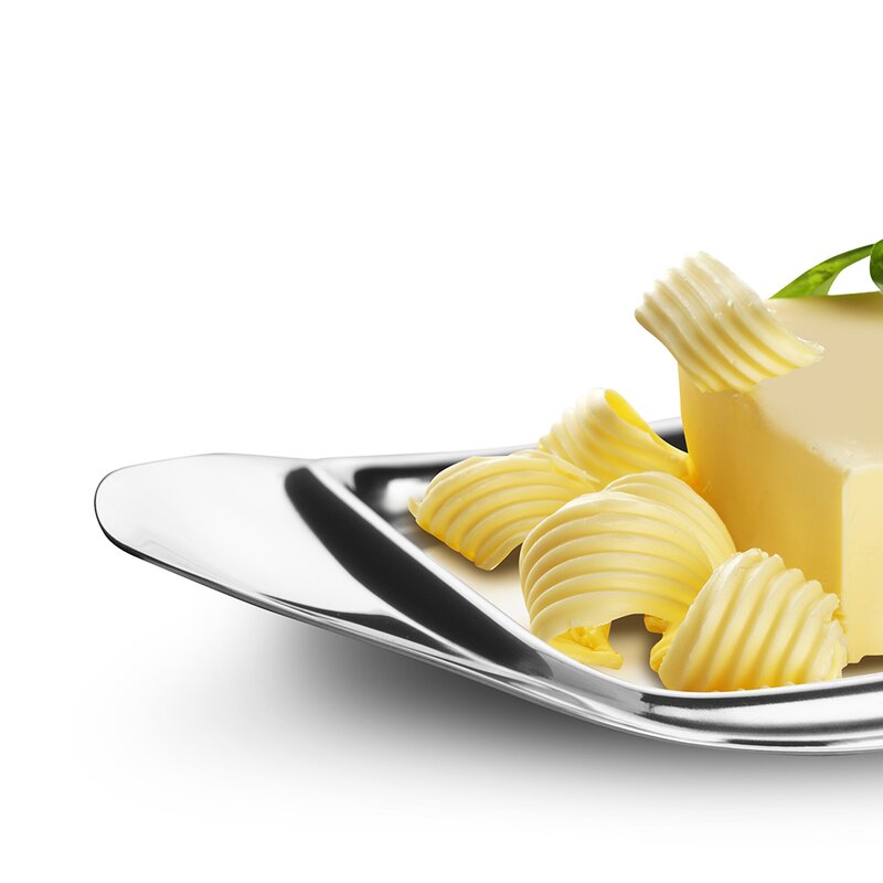 Dish is designed to keep butter from slipping off tray
