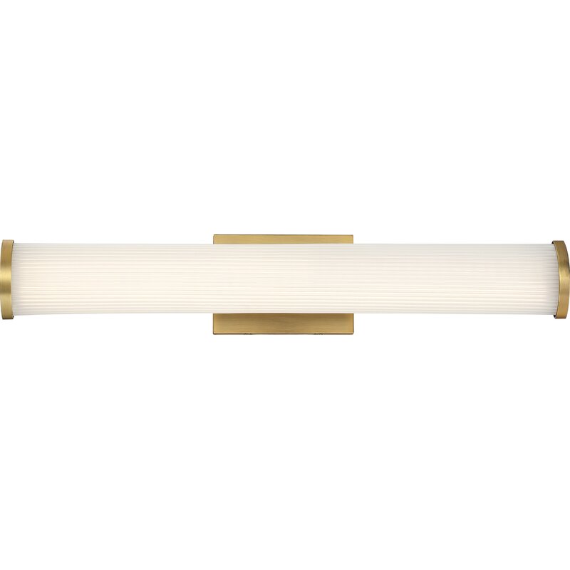We love how the gold finish and frosted glass on this 1-light bath sconce bring a Hollywood glam look to your powder room or main bathroom. This light is made from plated steel, and it features a clean-lined backplate that easily mounts horizontally or vertically on any wall that needs a little extra brightness. The shade has a long cylindrical shape made with white glass and capped at the ends with a brushed brass finish. Inside the shade, a built-in 26W bulb aims ambient light all around your space. Plus, this sconce is dimmable, so you can make the most out of your lighting.