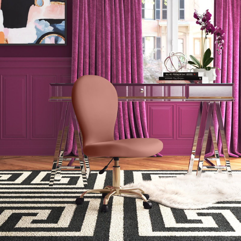 This task chair includes plenty of ergonomic features and glam elements to help make your office environment productive and stylish. It rests on a chrome frame with a gold finish, and it has five caster wheels for easy movement across carpeted and hardwood floors. This office chair is wrapped with velvet upholstery in a variety of solid hues to match your room’s current color scheme. Its curved silhouette, armless seat, and foam fill give you a space-saving and supportive option as you finish every item on your to-do list. Plus, there’s a height-adjustable seat and swivel function to better suit your needs.