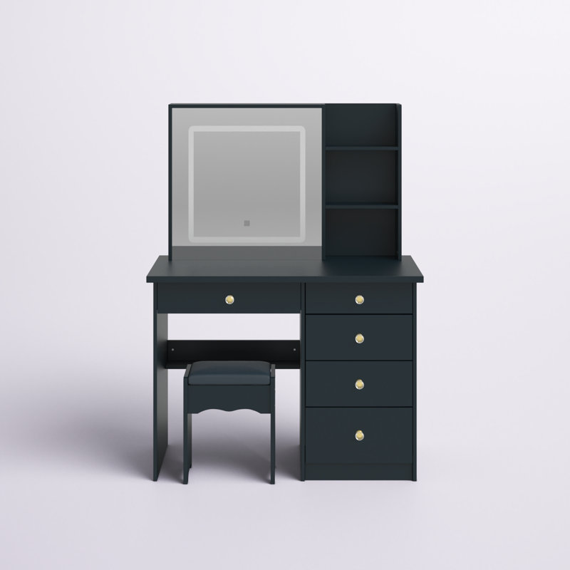 This vanity set includes a stool and mirror that gives you the right spot to get ready and store away your cosmetics in your bedroom or guest room. Its frame is made from solid and engineered wood with a crisp white finish for a modern look. Five spacious drawers accommodate jewelry, hair products, and other toiletries. The removable square mirror has a lighted design that lets you adjust the brightness. And the cushioned stool is filled with cotton, giving you lots of support while you sit. Plus, this vanity set has three open shelves for additional storage.