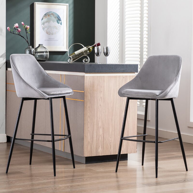 This set of two counter & bar stools is crafted with an iron frame with a black finish. They feature contoured bucket-style seats and four tapered legs. Velvet upholstery brings a luminous look over foam filling that provides just the right amount of support as you eat breakfast or enjoy a drink. These stools also have metal footrests that hold up in busy homes. Plus, we love that its low back means you can slide this stool underneath your countertop and out of the way.