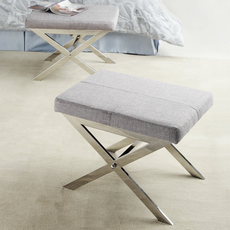 This vanity stool has a sleek, X-shaped base with a chrome finish that brings a glam contemporary look to your bedroom or living room. It’s made from metal, and it features a water-resistant design that stands up to spills and splashes. This stool has a 22″ wide square seat that’s upholstered in a linen blend with your choice of color. It’s also filled with foam for a supported spot to sit or place down a bowl of snacks during movie night. Plus, this vanity stool has a weather-resistant design that’s great for bringing outside on the porch or patio.