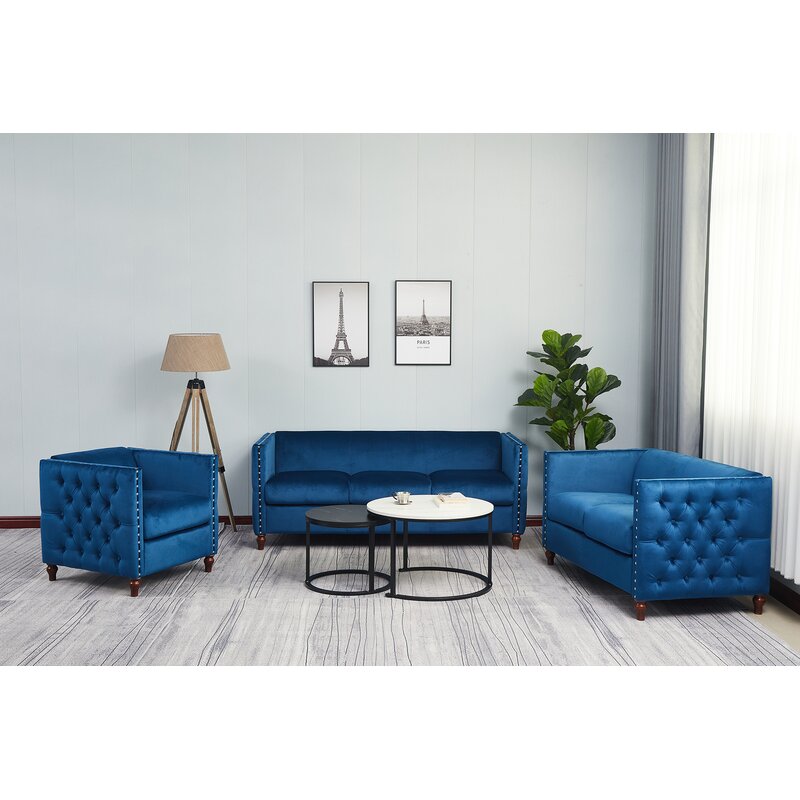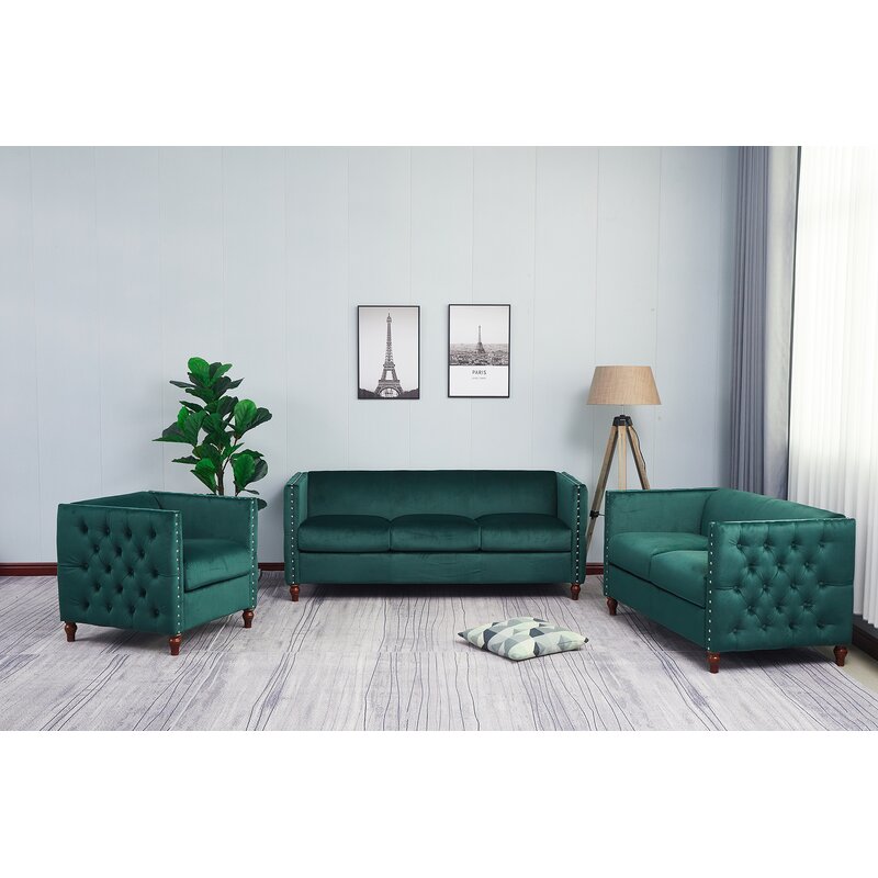 This 3-piece living room set has mid-century modern silhouettes and luxe velvet upholstery for a retro-glam look in your space. It includes a loveseat, sofa, and armchair. Each piece is built with an engineered wood frame, and they’re built on turnip feet with a rustic brown finish. The velvet is decorated with diamond-shaped button tufting all along the back and square arms for some Art Deco charm. Plus, they’re filled with foam and sinuous springs for the right amount of support during movie night or while you dig into your latest read. We recommend wiping the removable cushion covers with a dry cloth.