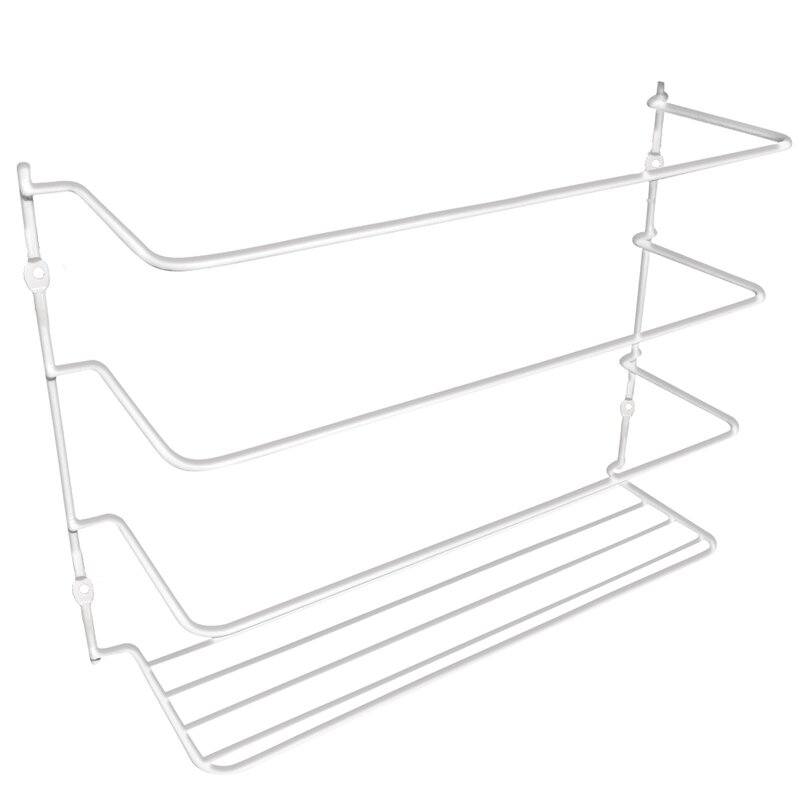 This set of 2, new and improved kitchen organizer rack will maximize your kitchen storage space.This space saver is great for organizing your plastic wrap, foil, wax paper, sandwich bags and much more! Made of sturdy, white, plastic coated iron that will not rust. Also great for organizing art supplies and wrapping paper. The wide support bars have indentations along the sides allowing for screws to support the storage rack wherever you chose to mount it. (Hardware included). Each measures approximately 11.75 inches Long x 3.75 inches Wide x 8.25 inches Height.