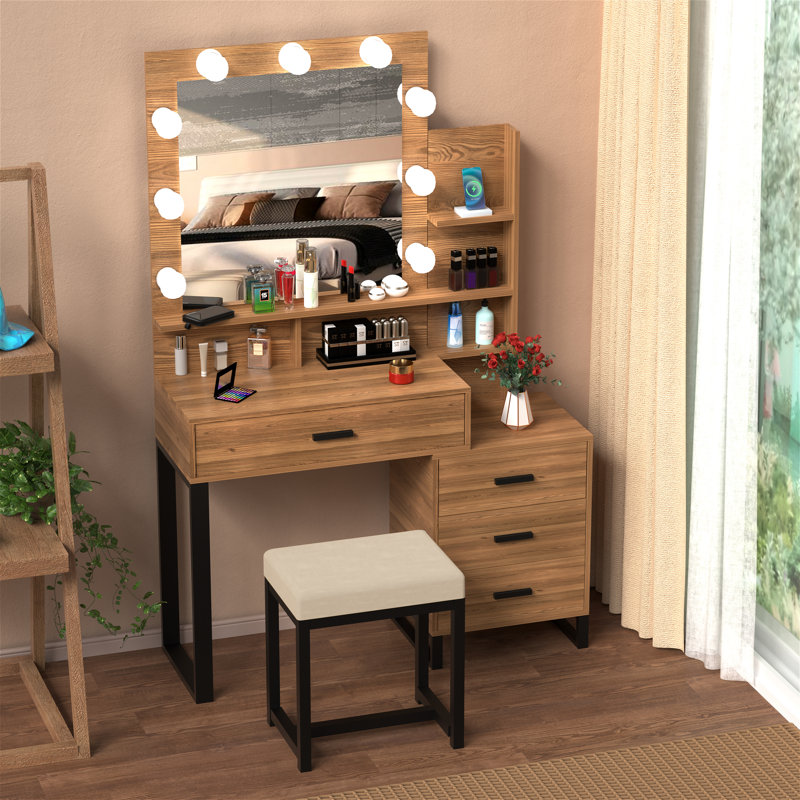 If you are looking for a vanity set that combines style and functionality, you will love this one. It features a lighted mirror with LED lights, a dressing table with drawers and shelves for storage, and a cushioned stool for comfort. This vanity set is perfect for small bedrooms, as it does not take up much space. You can use it to do your makeup, hair, or skincare routine with ease.