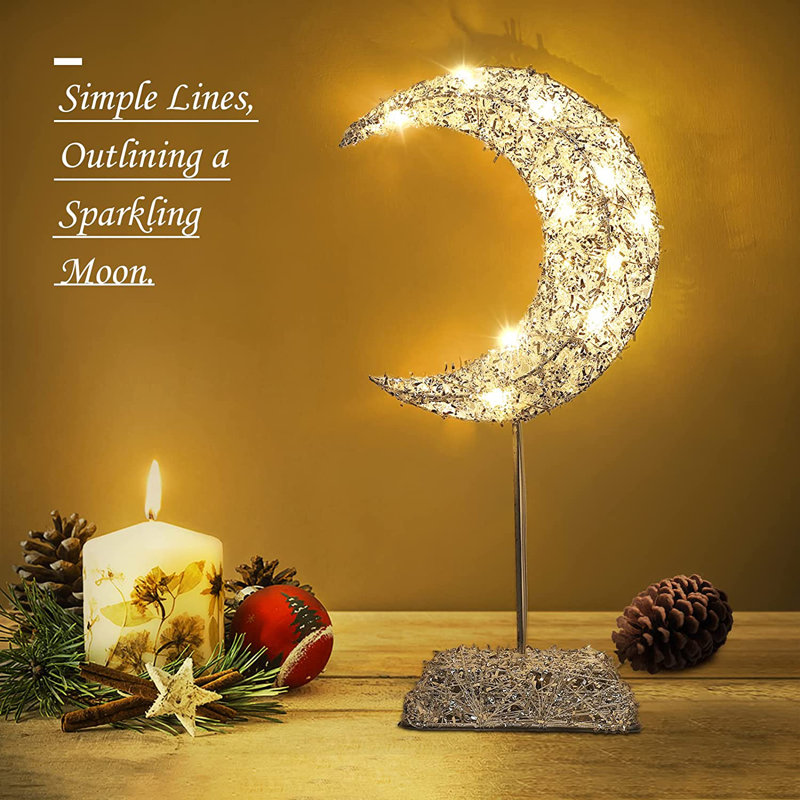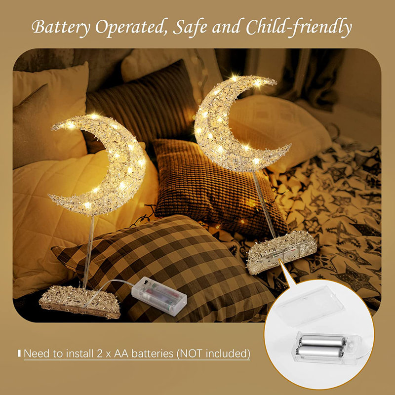 This table lamp has a unique shape of a ramadan moon, which looks very beautiful and luxurious when it is lit. Not only can be used for Christmas and festival decoration, but also can be used as bedside lamp to create different atmosphere. Crafted from durable wrought iron frame and wrapped with glittering confetti, this night lamp is very attractive even when you do not turn on the light. And when you turn on the light, the LED moon lamp will create sweet atmosphere for you. Just install 2 x AA batteries(Not Included) and push the button to turn on it, easy to operate. It can be used without plugging in, anti-electric shock, safe for children to use. 20 little built-in LED beads emit a soft and comfortable warm white light that make such a tiny moon lamp to light up the whole room, which is a great lamp for bedroom. The light is just right, neither too bright nor too dim, protecting your eyes and brightening your room as well as your mood. Such a shinning and beautiful moon light can be taken as a gift for your kids, friends, family and loved ones, especially in special days such as birthday and Christmas.
