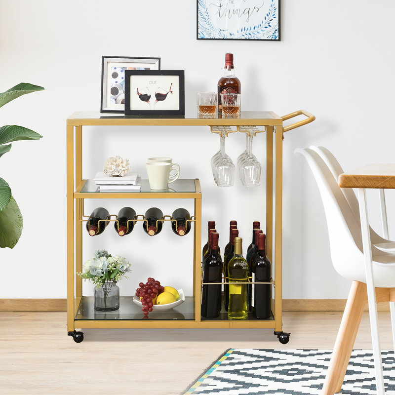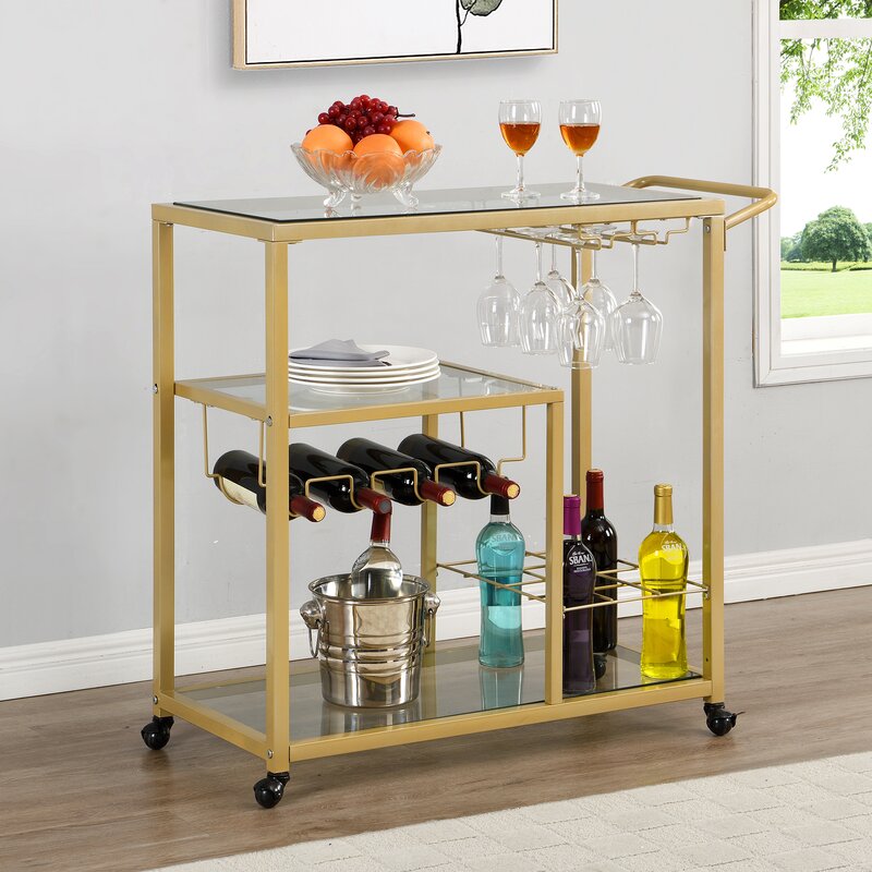 If you’ve ever wanted to have pieces in your home literally a la carte, a bar cart like this is a great option for you! Constructed of tempered glass and metal frame with gold finishes, the dining car is easily the focal point of your dinner, Thanksgiving, Christmas, New Year’s, family, and friends gatherings. What’s more, it is equipped with a wine rack and glass holder that can hold 16 bottles and 10 wine glasses. Combining aesthetic and craftsmanship elements, this gold-finished kitchen serving car has a stunning appearance that brings an elegant charm to your kitchen, dining room, wine cellar, hallway, and more.