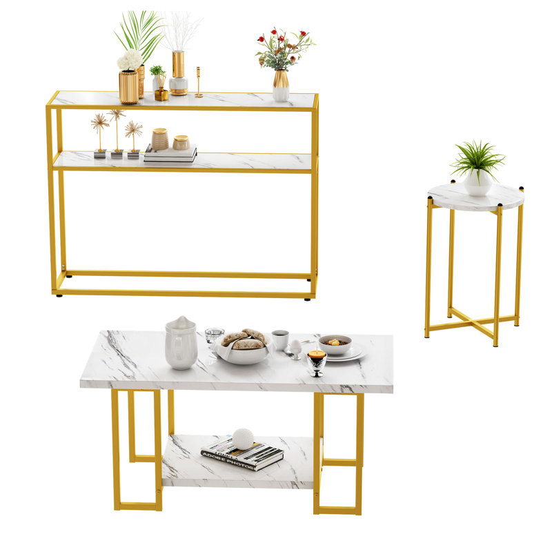 Instantly elevate your living room aesthetic with the mid century charm and indulgent marble of this coffee table set. Gorgeous white marble creates a stunning tabletop, creating a luxurious look in any living space. The cocktail table in particular has a wow factor found with its shining golden base.Elevate contemporary decor or bring instant indulgence to a mid-century motif. Whether used for gathering round with tea and snacks or as a surface for displaying mementos, this set will enhance any room.