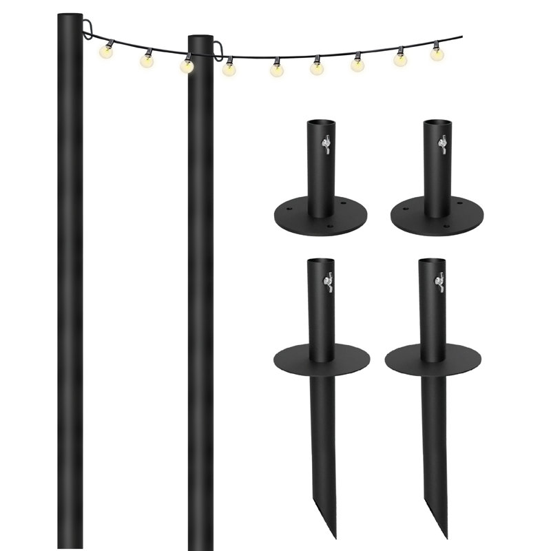 The string light poles are made from steel with a durable black powder-coat finish that adds a professional and elegant look to your outdoor space. Enhance the ambiance of your patio. Each pole extends to 10 feet tall and includes clips to keep your favorite string lights hanging securely above. Two types of bases are included for each pole; a flat base with 3 pre-drilled screw holes for hard surfaces such as concrete or wood, and a 10-inch yard stake base for softer surfaces such as grass or dirt. Bring the professional quality of commercial-grade lighting poles to your backyard or business year-round, without the fuss of flimsy poles or messy four-pronged stakes.
