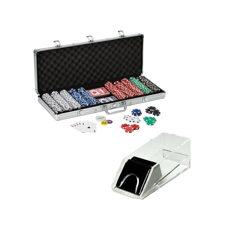 This bundle includes the 500 count texas hold’em dice poker chip set and four-deck card shoe. This poker chip set includes 500, 11.5-gram claytec chips of varying colors, housed in a handsome aluminum case with black accents for easy transportation and organization. You and your friends will be well equipped to play out of the box with two included decks of standard playing cards, along with the full set of the big blind, little blind, and dealer buttons. The included four-deck card shoes ensure you’ll always have a deck on standby, helping cut down on time shuffling between games.