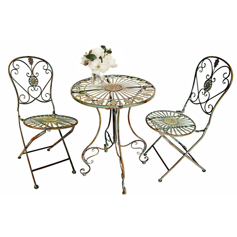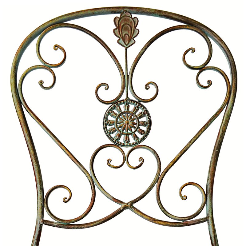 Featuring a romantic green patinated metal with a trendy antique look, this wonderful set of garden bistro chairs offers an exquisite atmosphere for your garden. The neutral tone of this piece allows it to blend perfectly with almost all other furnishings or garden styles. Additionally, it boasts a unique style through the intricate detailing on the back of each chair. Able to fold conveniently for storage, this is a practical and beautiful piece.
