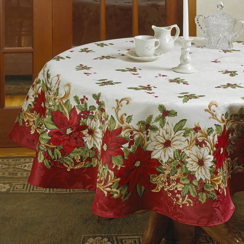The right table set can turn any meal from dreary dinner to a fabulous feast! Crafted from 100% polyester for its stain- and fade-resistant qualities, this decorative Christmas tablecloth showcases an elegant holiday motif with blooming poinsettias and festive holly berries in rich hues of red, green, white, and gold. Measuring 70″ x 70″ overall (great for circle or square tables), this design is iron safe and can be machine washed and tumble dried for effortless clean up after dinner.