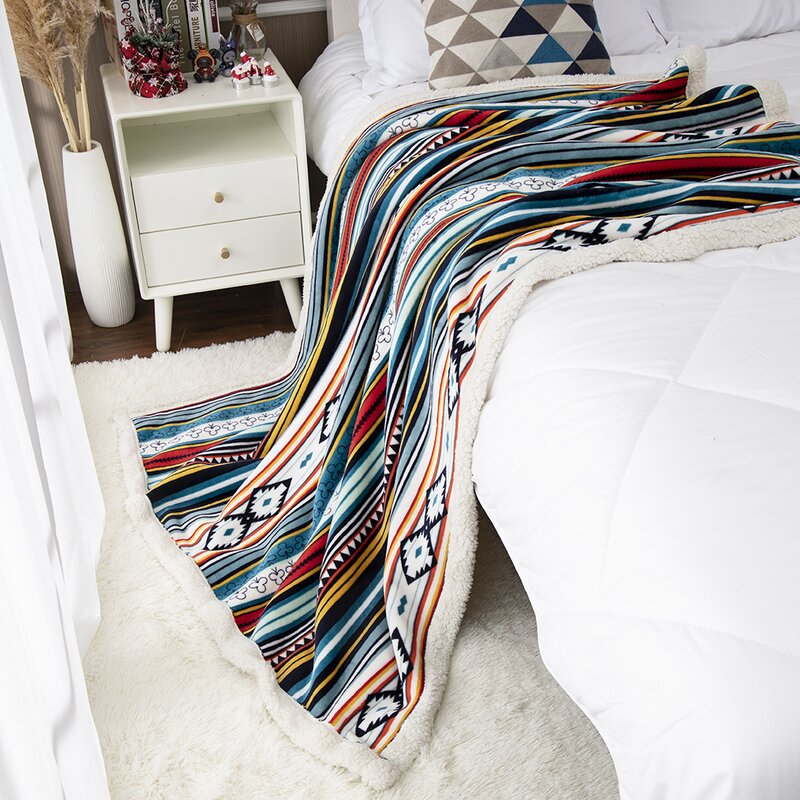 This blanket is so colorful, soft and warm! It arrived earlier than I expected it and came in a vacuum-packed package. When I pulled it out of the package I was so excited! The colors are vivid and it feels so soft. I love the Southwestern pattern and the fleece trim that goes all along the perimeter of the blanket. I would highly recommend this throw. It is sturdier than others I have, and is not prone to cat claws snagging! I give it a 10.