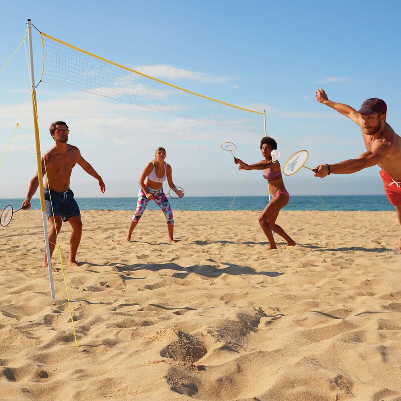 ALL IN ONE SET: This set comes with (4) steel badminton rackets, (2) nylon birdies, (6) stakes and guy ropes and a deluxe carry bag to help transport and store all the components with ease!