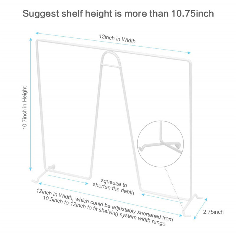 This set of 8 wire shelf dividers will help you get rid of clutter and keep your closet organized and clean. Specially designed to simply clip into a 12″ closet wire shelving system. Each shelf measures 10.7 inches in height and 12 inches in width, and can be adjusted from 10.5 inches to 12 inches to fit the width range of the shelving system.