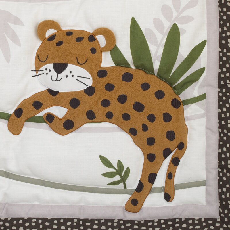 Cuddly sweet animals are the stars of the jungle gym 4 pieces crib bedding set. Set includes a printed comforter, fitted crib sheet, crib skirt, and nursery organizer. The printed comforter measures 36″ x 45″ and features a lovable sloth, cheetah, koala bear, and toucan bird, in shades of grey, brown, and green, all relaxing underneath botanical leaves and vines. The comforter is finished with a printed border in a sweet brown and white dot print. It’s the perfect size to use for tummy time! The crib sheet is a two-tone grey and white cheetah print, in soft 100% cotton, with fully encased elastic sides for a secure fit. A solid ivory crib skirt with a brown dot border completes the crib. The reversible storage and has a grey and white cheetah print on one side that reverses to brown and white spots on the other – the perfect size to keep all your nursery essentials organized!