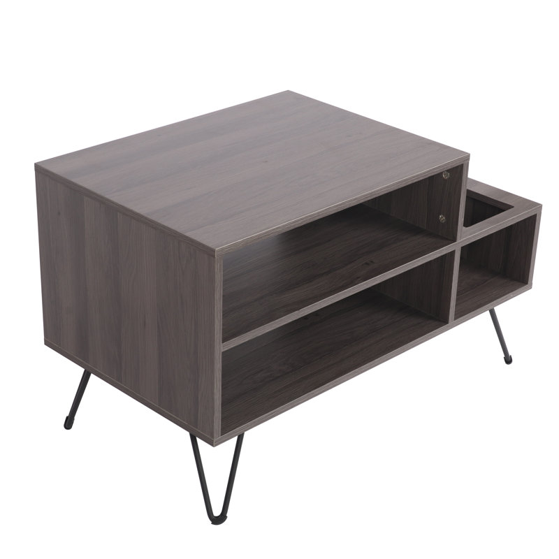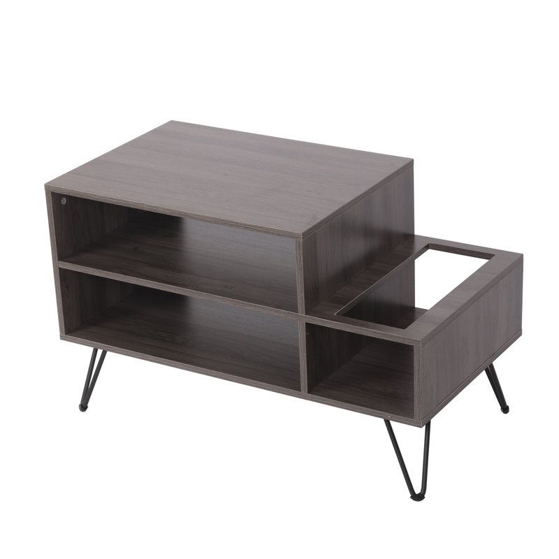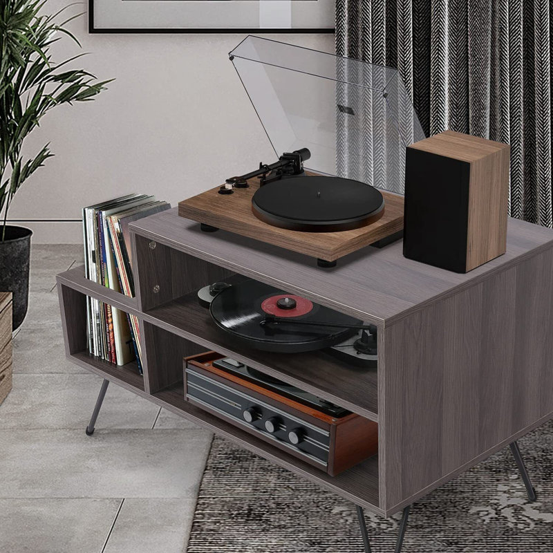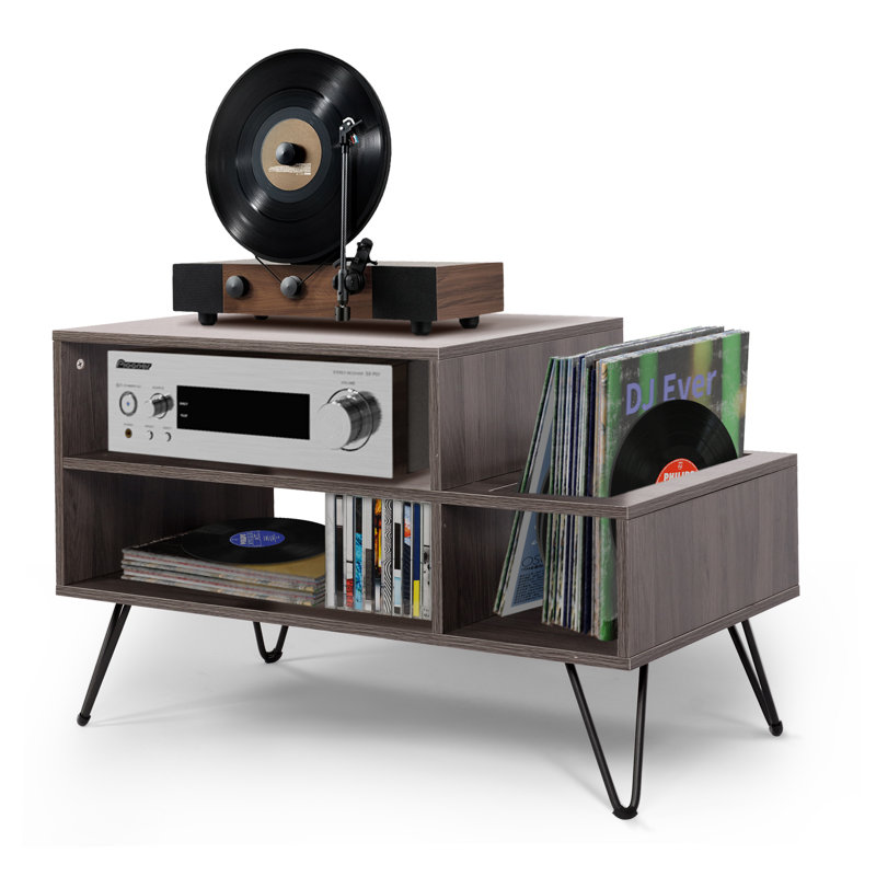 This retro record player stand cabinet features a wood-finish frame with metal hairpin legs, easily bringing iconic style to your living space. Complete your collection with our record stand cabinet