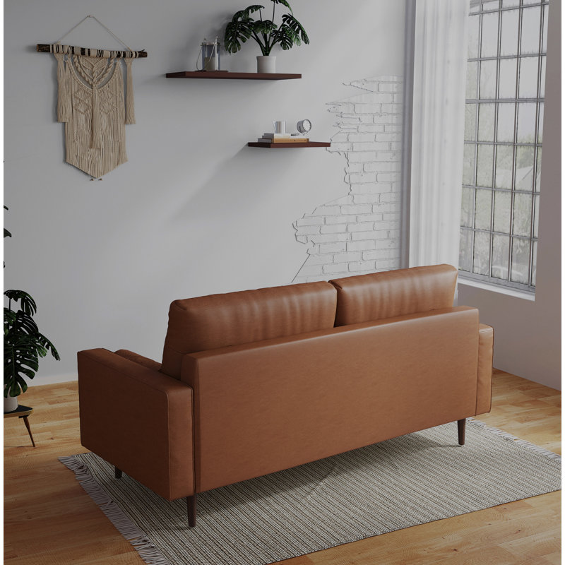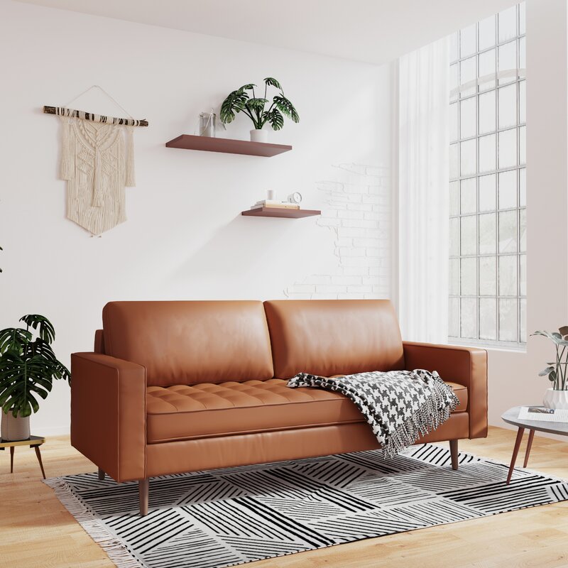This sofa foam padding and web suspension offer you the ultimate comfort and support whether you are enjoying your morning cup of coffee, entertaining your friends, or working from home. Hand-stitched corded edges and button tufting offer the couch its finishing touches, giving it a look that is worthy of being the centerpiece of your living room. Crafted for luxury, the sofa boasts a solid wooden frame with gorgeous pecan-finished legs and faux leather upholstery.
