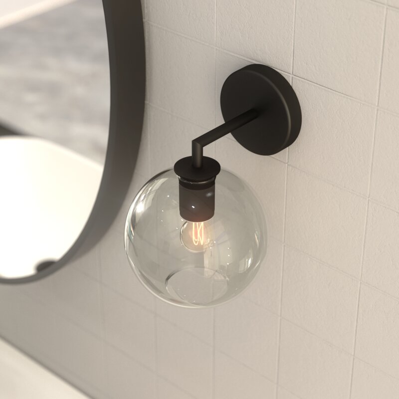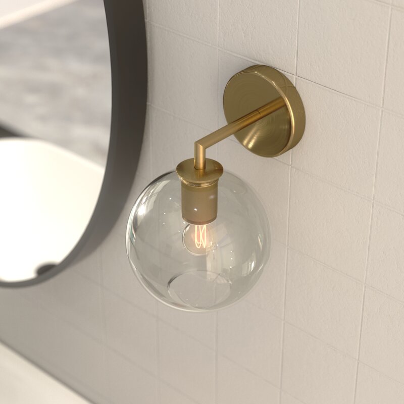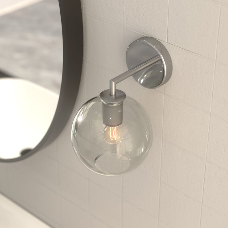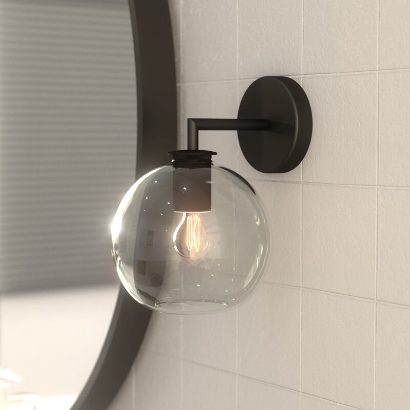 Crafted from a metal backplate and arm, this one-light bathroom wall sconce is defined by its clear glass globe shades that lend it a dash of mid-century-inspired style. A perfect selection for perching next to a vanity mirror that delivers all-around illumination. Accommodating an E26 socket base with a wide range of available selections from dimmable to non-dimmable LED bulbs. Designed to perform in a damp area with a moist and steamy environment.