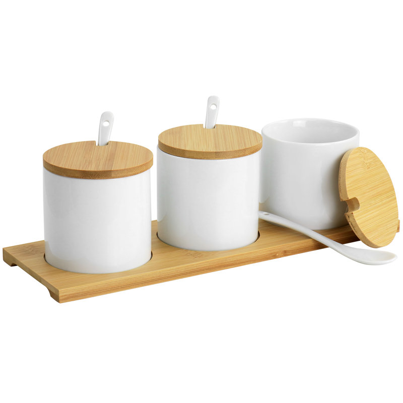 The Gibson Elite 10 piece condiment jars set is designed with sophisticated style that brings character and richness to the table. The classic design blends seamlessly with a wide array of colors and motifs, perfectly fitting in to your home and kitchen decor. Set comes with three condiment jars with bamboo lids and a bamboo base that keeps everything in place- great for keeping at the center of your table for family meals and special occasions. Each jar comes with a small serving spoon for easy access. Jars are dishwasher and microwave safe.