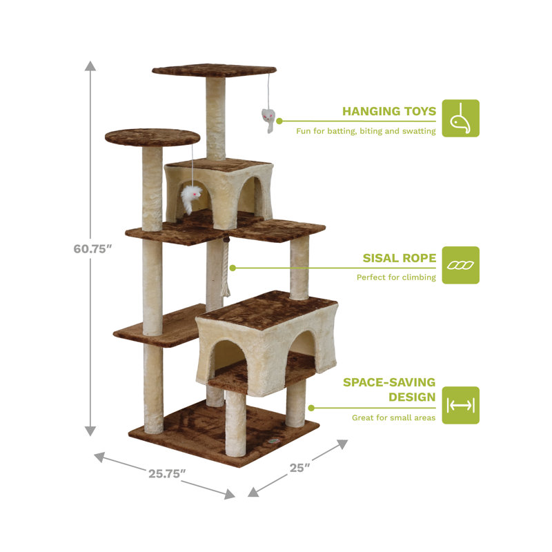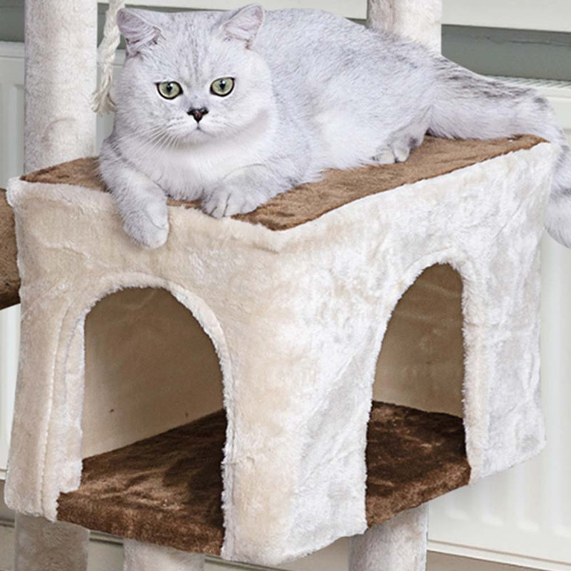 Attractive and mostly sturdy cat, it shakes a little when the cat jumps or runs hard onto it. I have a 10 lb cat and the cat tree is a good size, he even fits in the smaller condo. Assembly wasn’t too difficult, it just took time almost an hour and a half. For the price, it is a good buy.
