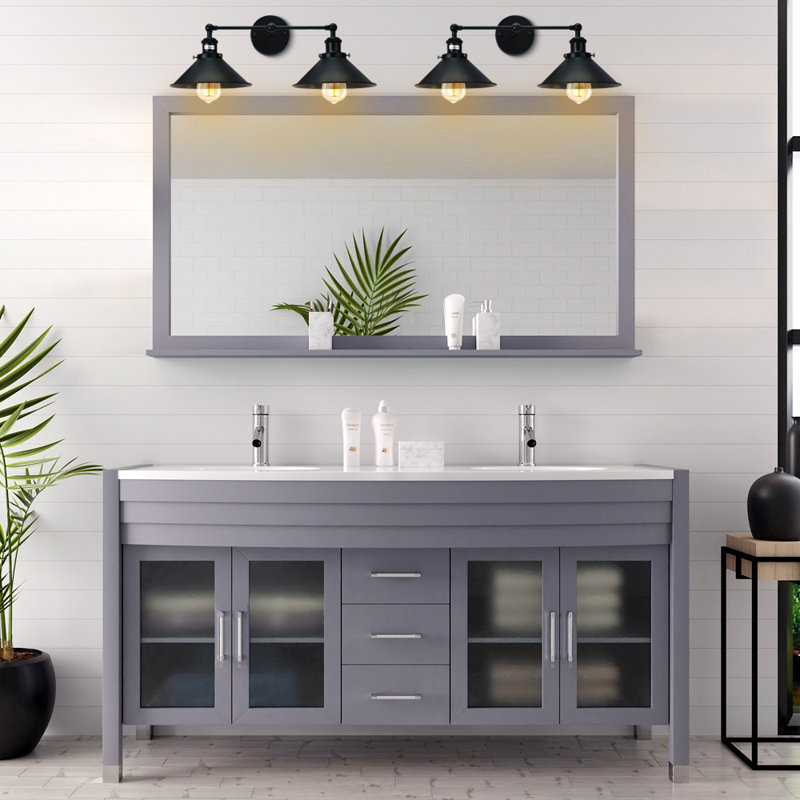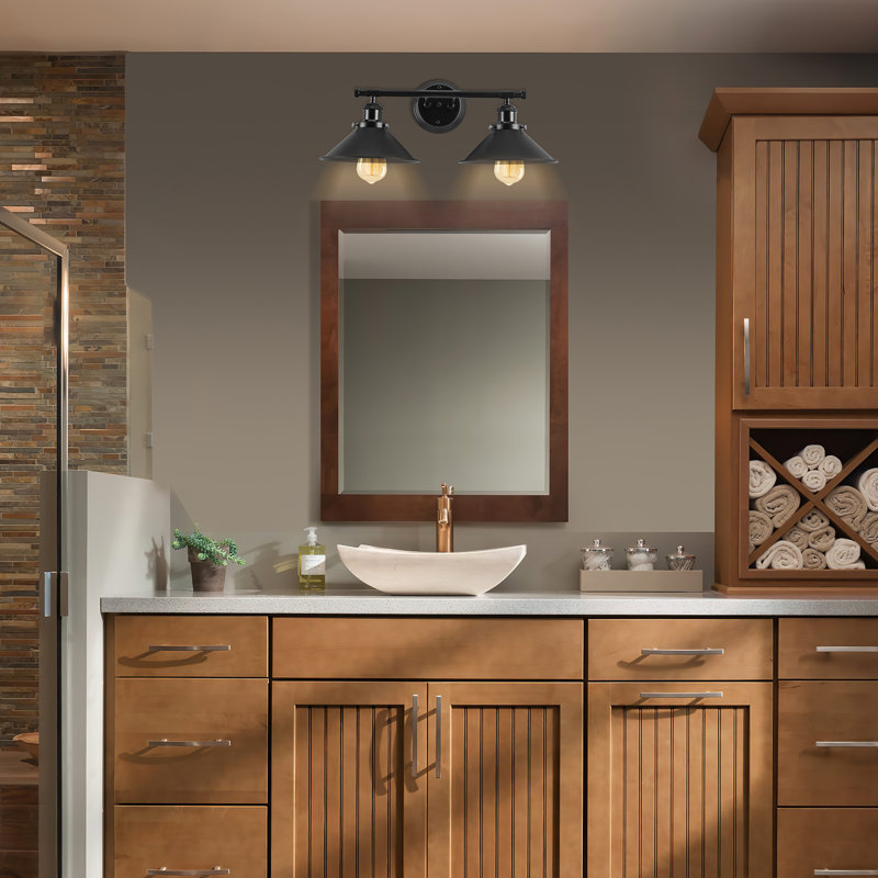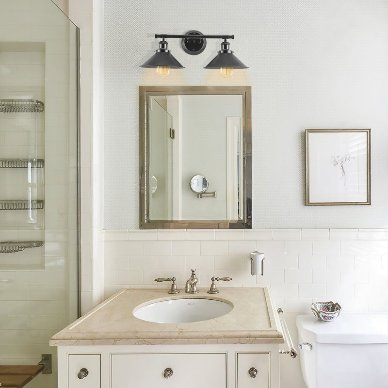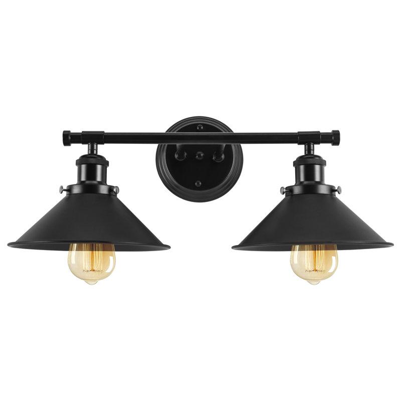 Exterior 2 Light Industrial wall lighting black matte lampshade enhances the soft warm glow of this fixture. This black farmhouse bathroom light fixture offers a modern industrial and rustic look.