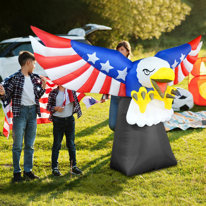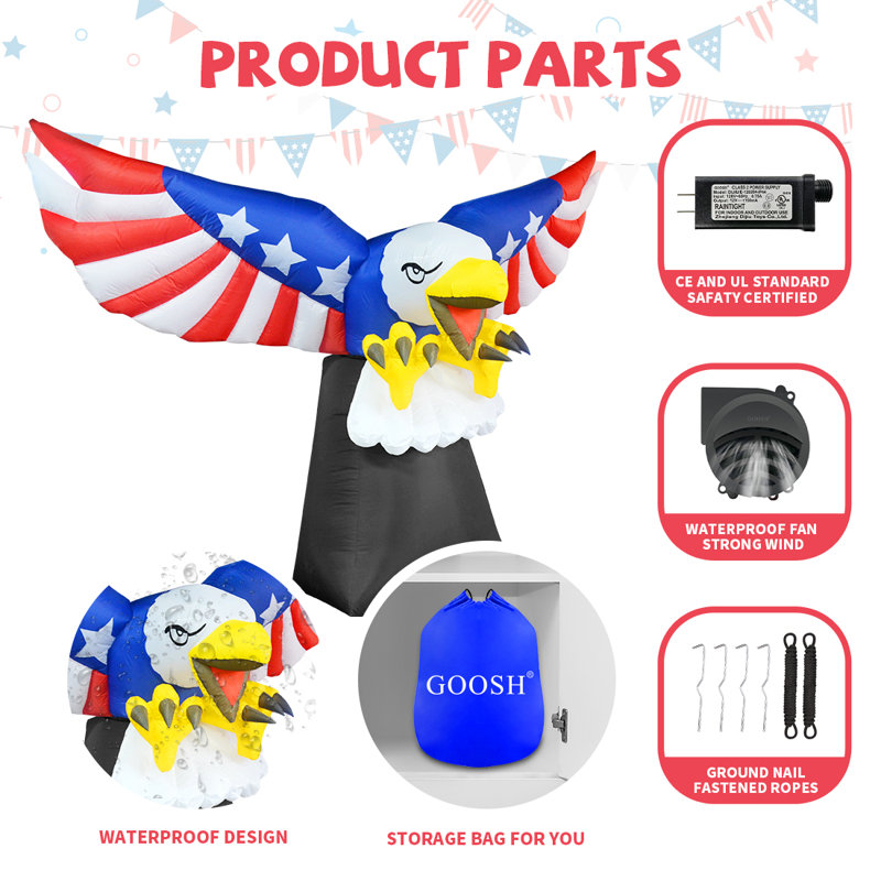 Just plug in this inflatable eagle, for only a minute it will be standing up to its full height, ready to delight all your neighbors and guests, the combination of American flag and blow up eagle is full of joy and festive atmosphere. Our GOOSH 4th of july inflatable is made of high-strength waterproof polyester which is against rips and tears, excellent stitching. Inflation is easy and speedy with included waterproof powerful blower for this 8.5FT 4th of july decorations. Just zip up and plug in, and the independence day inflatable will self-inflates in minutes. Coming with a CE and UL standard safety-certified adapter with a 10 FT power cord, you could place this patriotic inflatable to anywhere you want, like garden, patio, themed parties, lawn and more. No need to worry our fourth of july inflatable bald eagle will fly away by the wind. Ground stakes, fastened ropes, and built-in sandbags will provide better resistance to the various environment conditions. Eye-catching bright pure white LED lights make this 4th of july inflatables look perfect every holiday night. Storage bag enables you can store this patriotic inflatables outdoor decorations easily when you do not use.